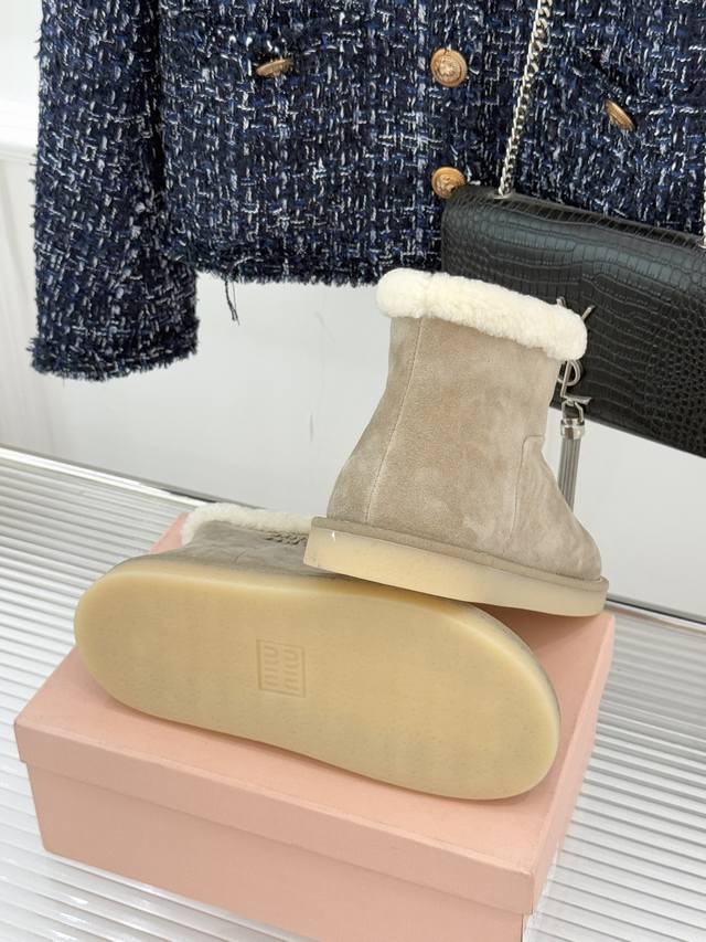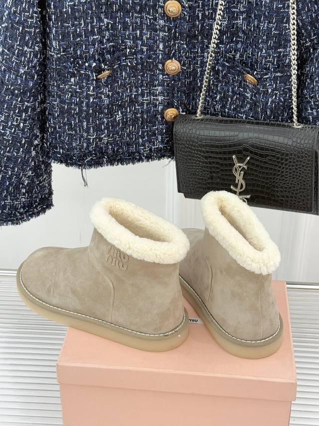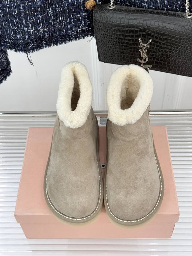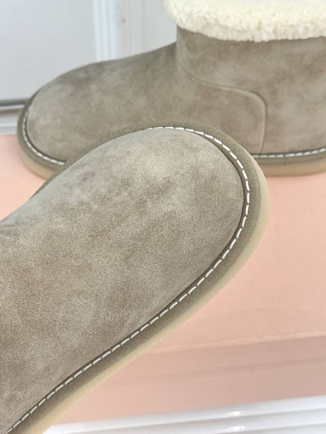 厂价 Miu Miu 缪缪25Wf新品复古羊羔毛 厚底雪地靴 当复古肌理碰撞柔暖触感 它以 Femininities 主题为核心理念 将少女感与实用性编织成寒冬的时髦符号 重新诠释女性气质的多元可能。 甄选进口新西兰牛反绒皮打造鞋面 日常污渍只需轻刷即可打理 羊羔毛从鞋头到鞋垫形成全包裹式暖意 靴筒字母低调点缀的品牌标识 与软糯毛感形成细腻反差 不经意间流露辨识度。 靴口翻折穿更添复古层次。 手工收线的细腻工艺加持 让毛感与皮面的衔接长久精致。 这双雪地靴不止是御寒单品 更是Miu Miu对女性魅力的温柔