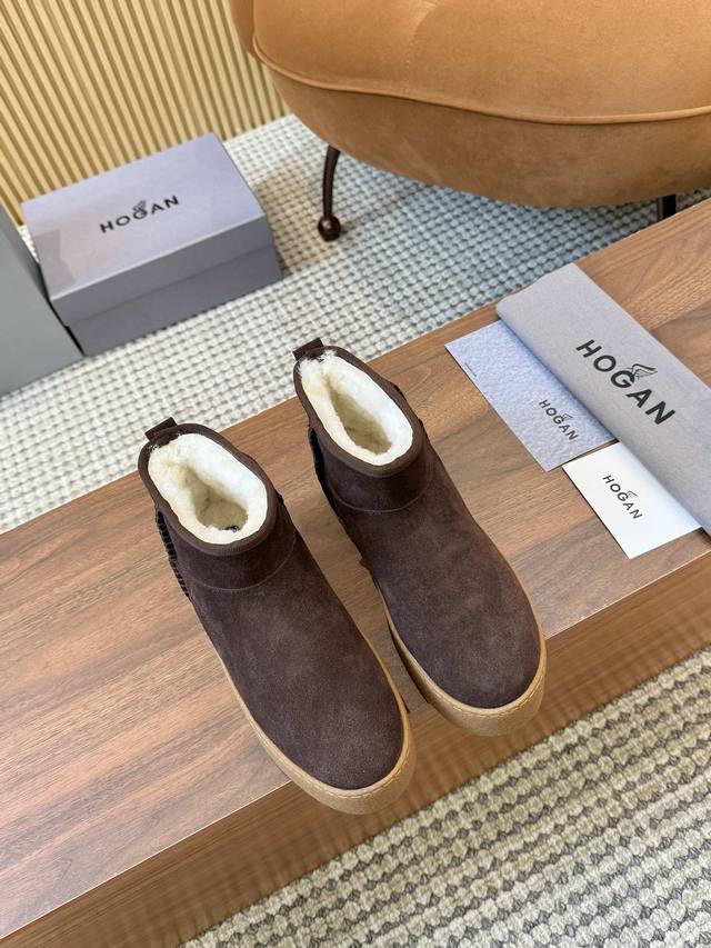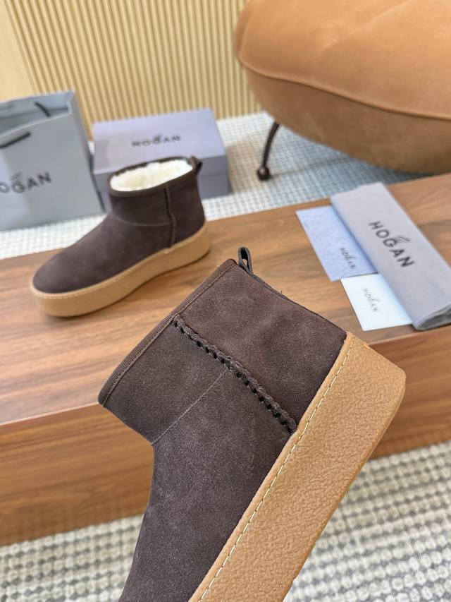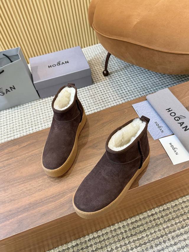 实价不让利 !爆爆爆 霍根Hogan新款, 女士时尚圆头真皮羊毛短靴,运动休闲,厚底让你穿上瞬间长高55Mm。绒面小牛皮手工拉线,新时代简约的美感 ,后置提鞋环