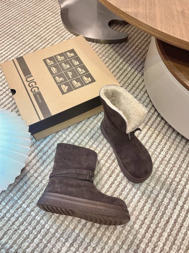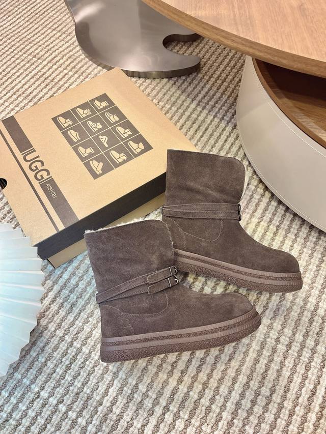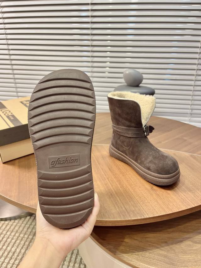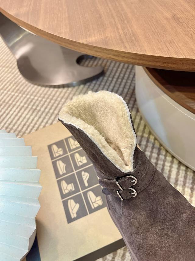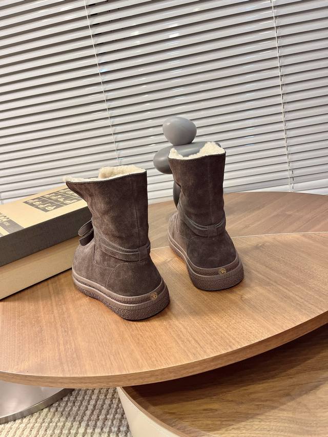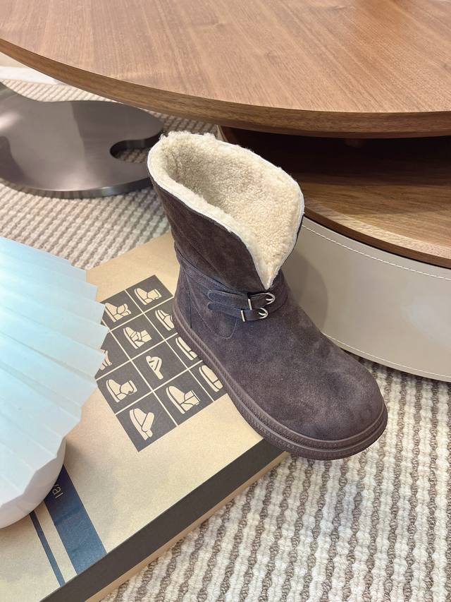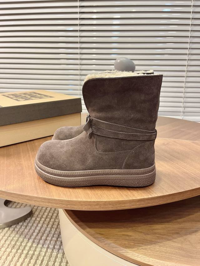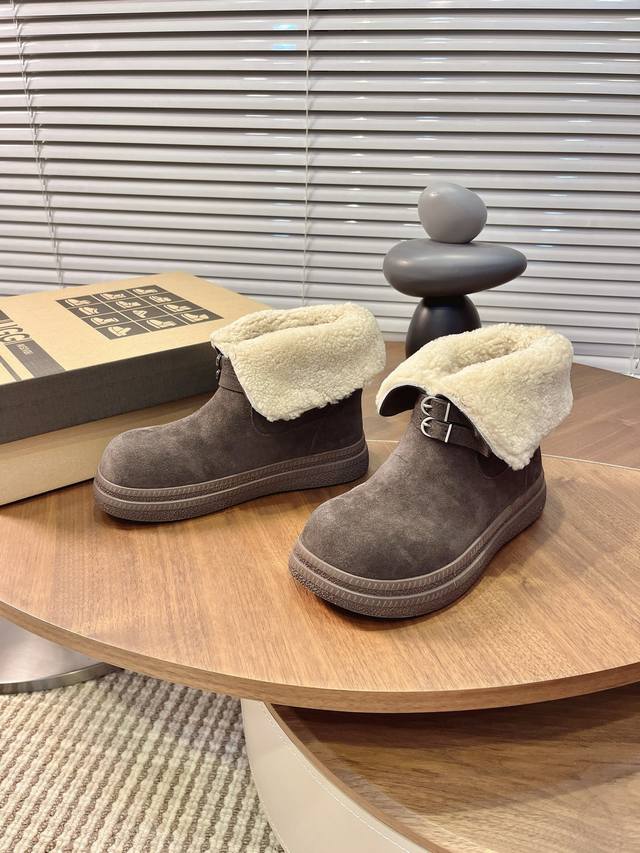 / 实价: 短筒雪地靴 :秒变大长腿 两穿可翻毛 :牛皮鞋面内里羊毛一体皮扣设计 :高筒立起保暖有型 靴筒放下秒变慵懒短靴 两种风格随意切换 奶里奶气 毛茸茸慵懒风