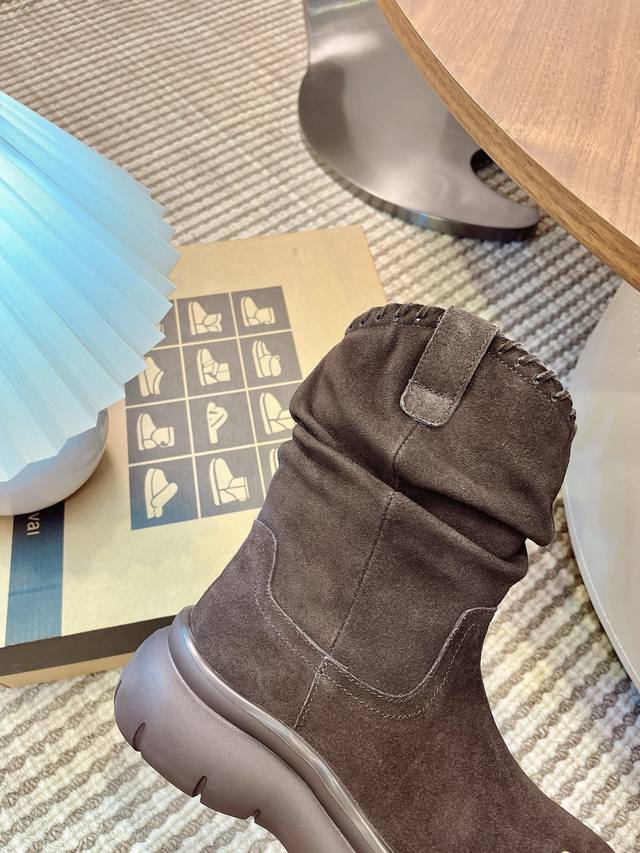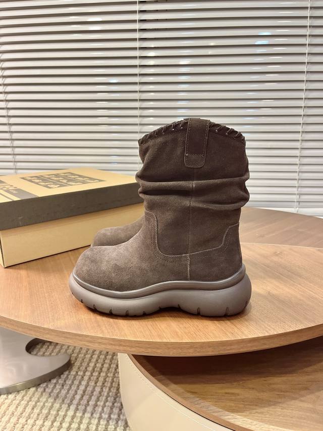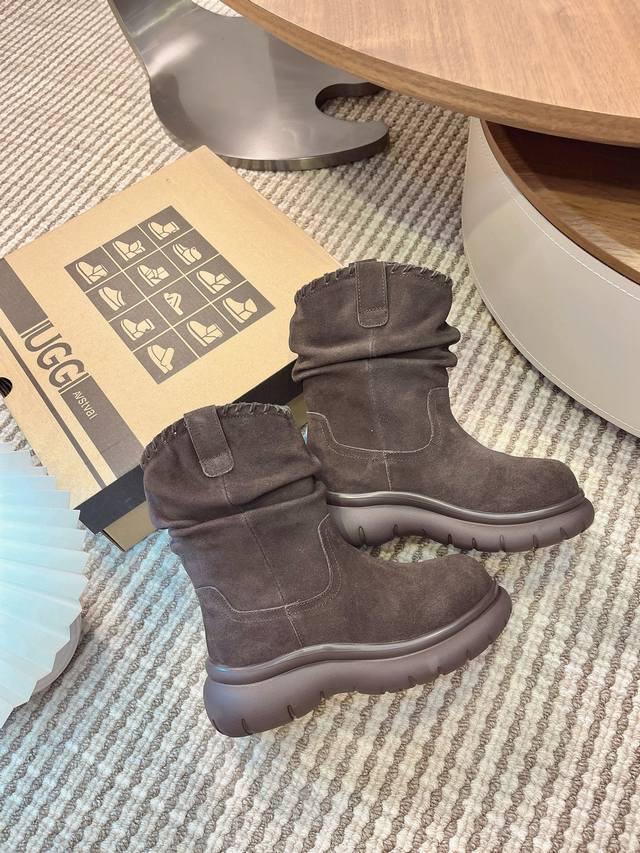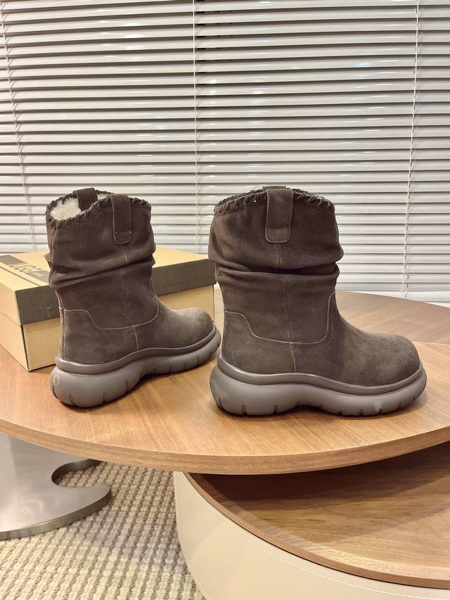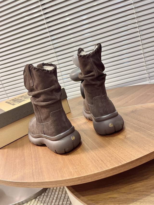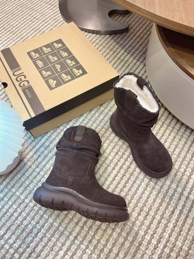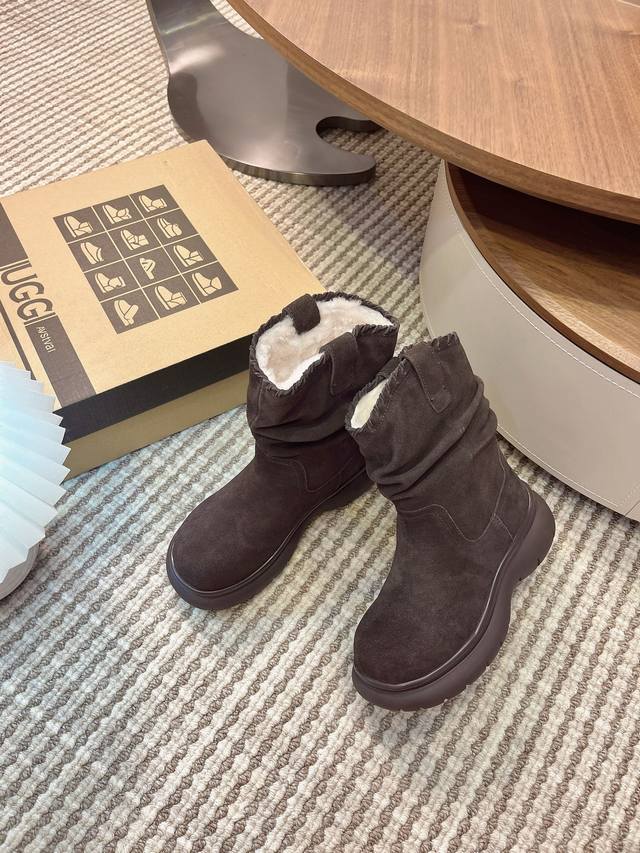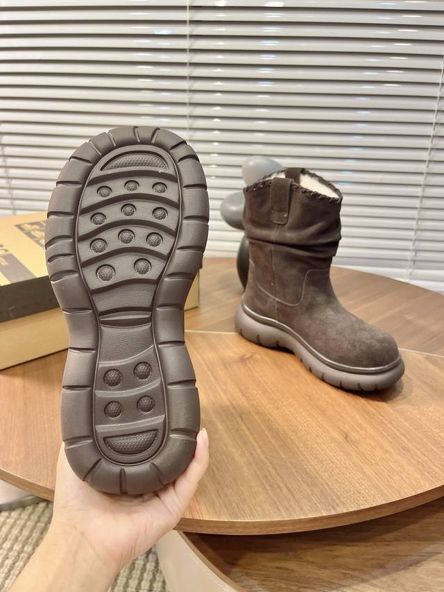 / 实价: 短筒雪地靴 :靴筒专属打褶设计 超显大长腿 :头层牛皮鞋面内里羊毛一体 :鞋底前薄后厚 行走如履平地 防滑耐磨 毛茸茸慵懒风 秋冬色系搭 配时尚元素爆棚