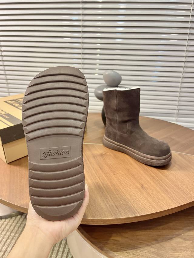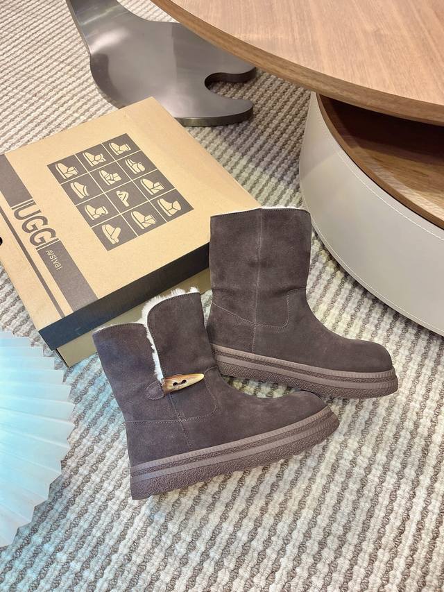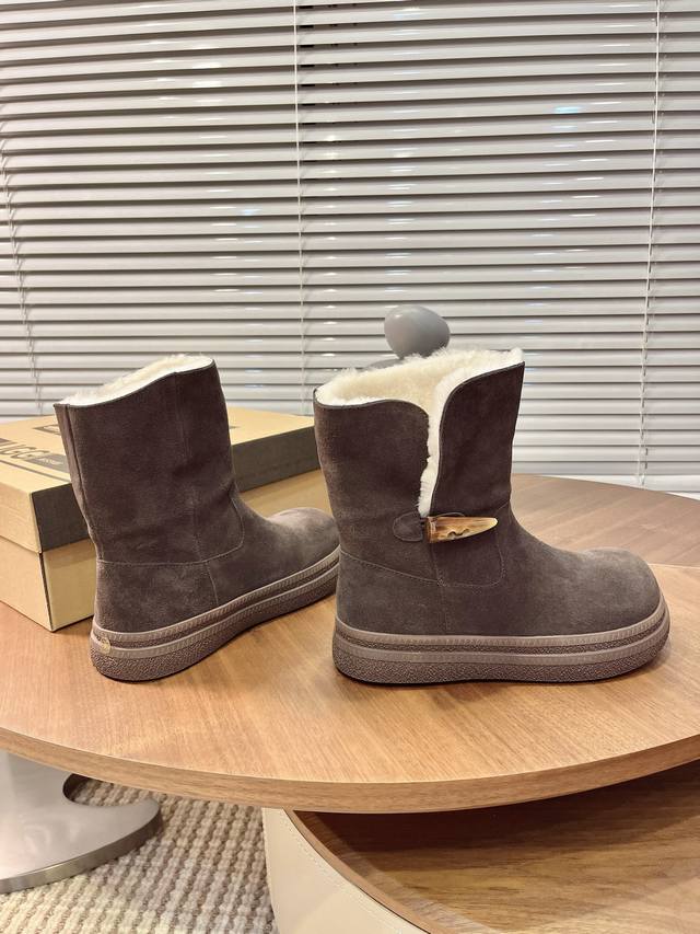 实价: 短筒雪地靴 :靴筒侧边牛角扣设计超显大长腿 :头层牛皮鞋面内里羊毛一体 :防滑耐磨 毛茸茸慵懒风 秋冬色系搭 配时尚元素爆棚 鞋面:羊皮毛一体 尺码:3