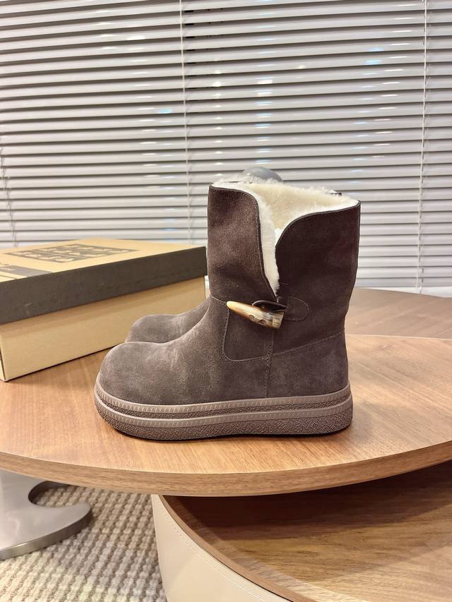 实价: 短筒雪地靴 :靴筒侧边牛角扣设计超显大长腿 :头层牛皮鞋面内里羊毛一体 :防滑耐磨 毛茸茸慵懒风 秋冬色系搭 配时尚元素爆棚 鞋面:羊皮毛一体 尺码:35-40