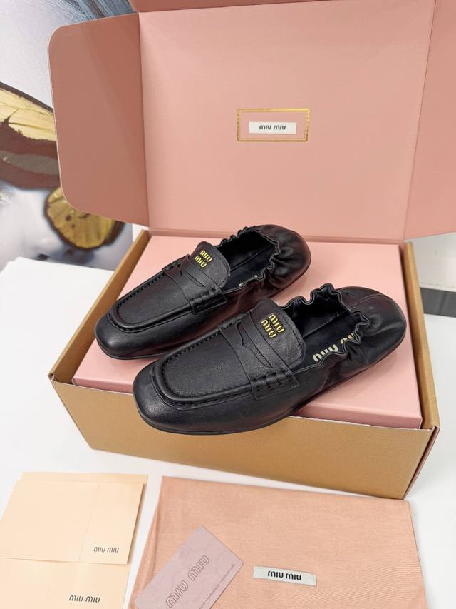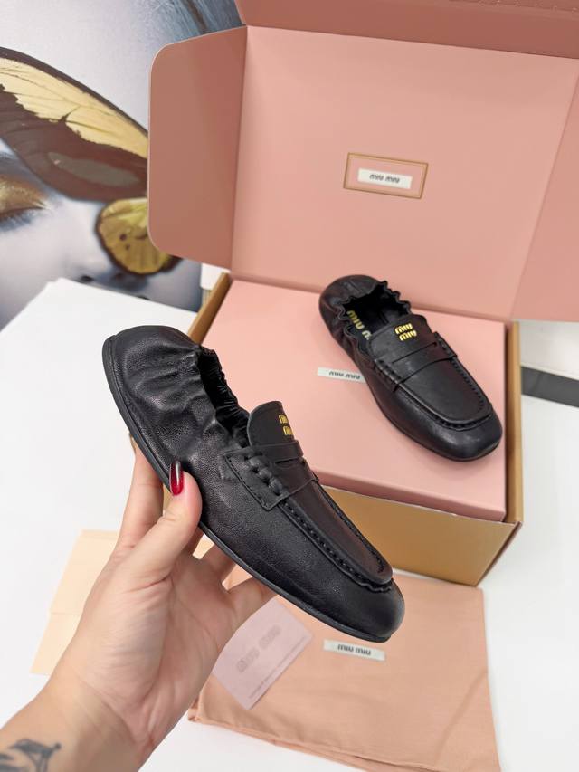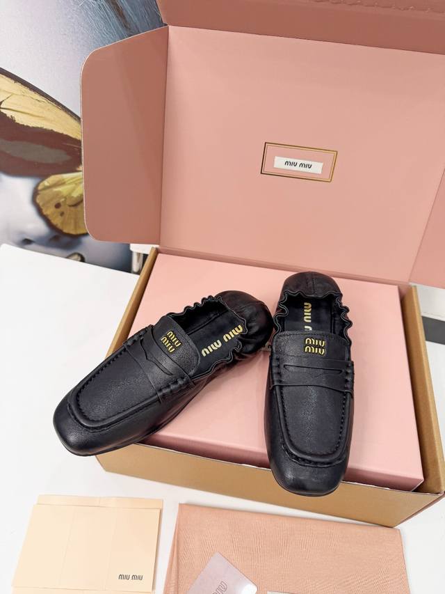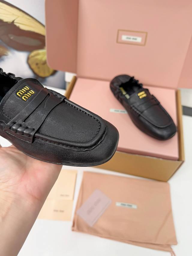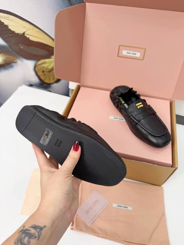实价: Miu Miu全新Nappa羊皮抽褶乐福鞋 Ddd 以更复古的造型重新打造经典乐福鞋,Miu Miu新款羊皮后跟抽褶乐福鞋采用Nappa皮革制成彰显优雅复古气质。后跟抽褶的设计方便穿脱的同时更是带有老钱的松弛随性感。 Ddd 鞋面饰有金色压花徽标,精致细节点缀整体设计,低调又别具风格 DDD 码数:35-40 34,41,42定制不退换 Ddd 飞机盒10 DDD
