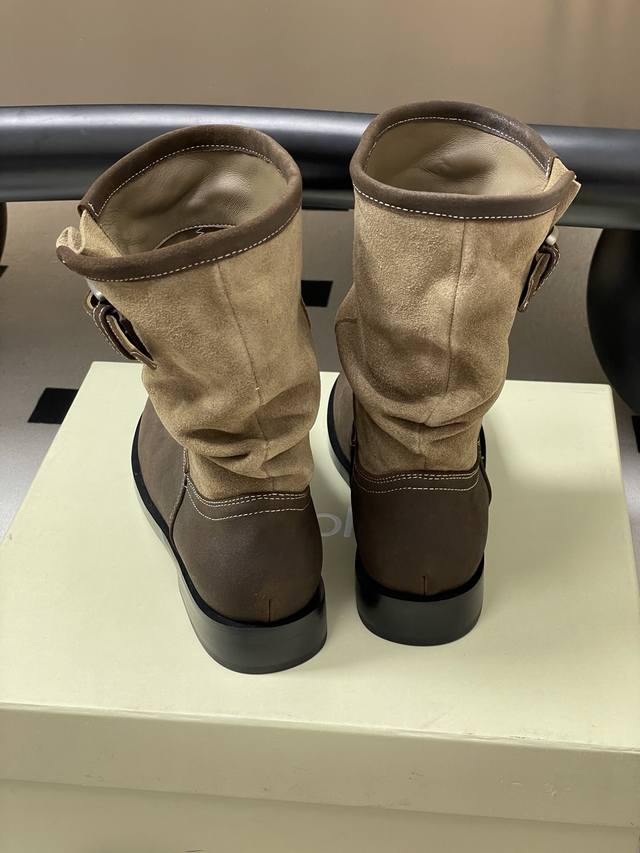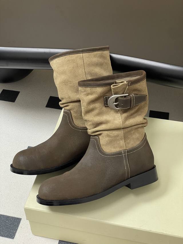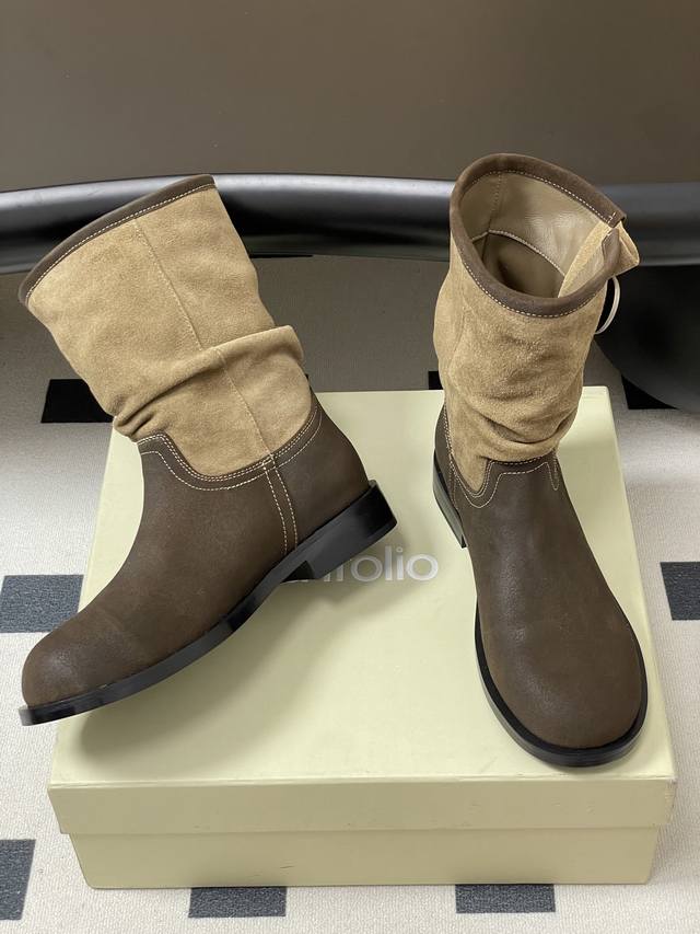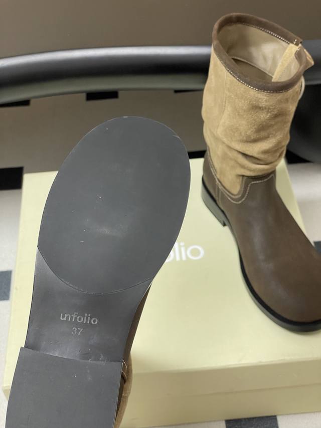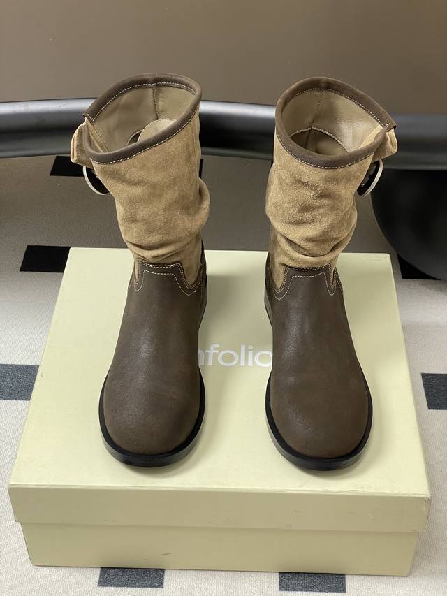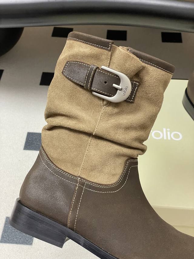 小众品牌 Unfolio 25Aw秋冬新款皱面宽筒一脚蹬直筒靴搭扣短筒堆堆靴 Ddd 这双靴简直是秋冬时髦王炸 卡其与深棕撞色 自带复古腔调 褶皱设计+金属扣 细节感拉满 上脚随性又有范儿 不管配大衣还是卫衣 都能轻松穿出高级感~ Ddd 不同配色的鞋面分别采用光面质感的小牛皮、做旧表面质感的牛皮与翻毛皮拼接以及全翻毛皮作为鞋面,靴筒内里则选择细腻的弹力莱卡织物,材质顺滑流畅,入脚的一瞬,便能即刻感受到靴子特有的舒适感。特别定制的加厚橡胶鞋底,方便打理,更适合日常高频率穿着。 Ddd 鞋面:小牛皮 牛反绒