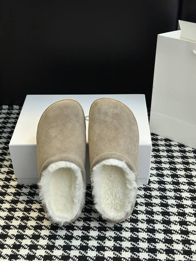 小众羊毛拖鞋 打造舒适而质感的经典鞋履。原版一比一开模,大气的造型与经千百次调整的腰位线条,独具经典。 圆圆的鞋头特别显腿细 鞋面材质:绒面牛皮 内里材质:A级