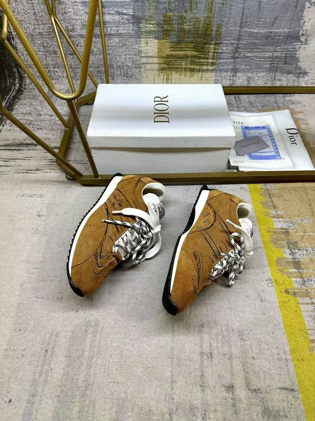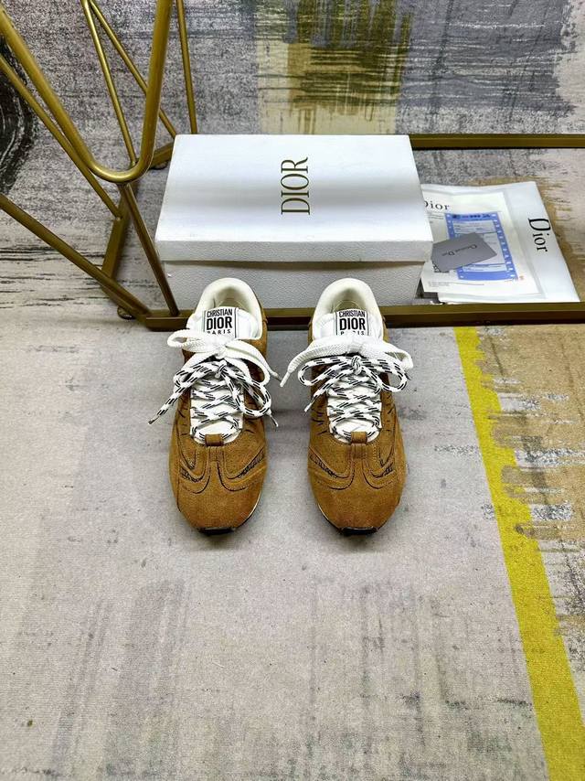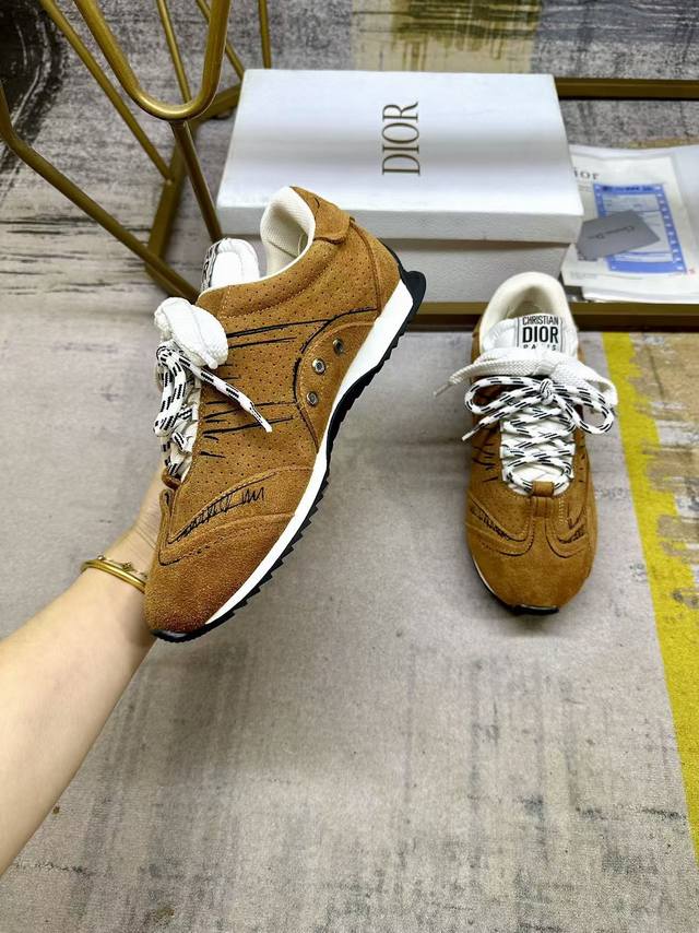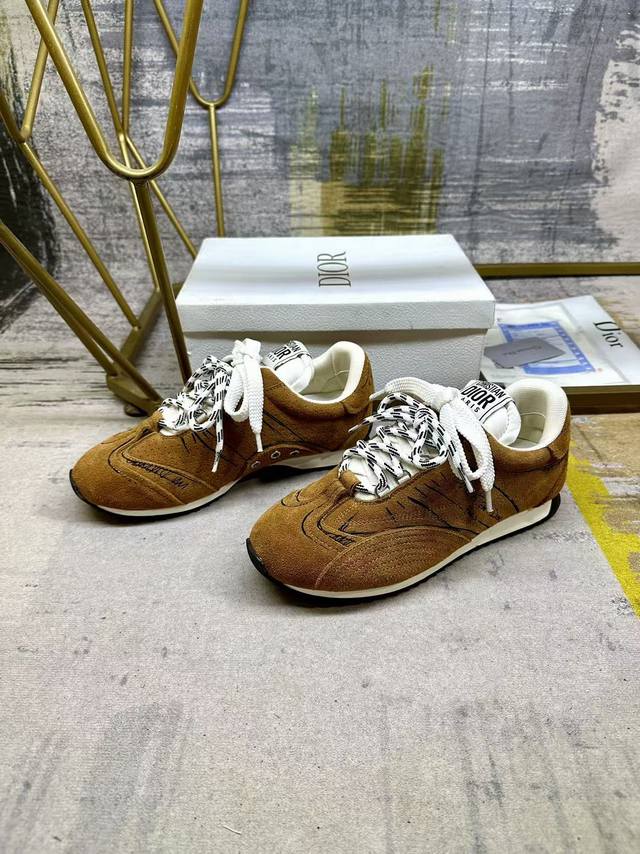 / 工厂p价 女装女鞋 运动原单这款D-Sketch运动鞋彰显经典复古美学风格,采用棕色绒面材质精心制作,饰有灵感源自鞋履制作阶段的印花标记,搭配双色鞋带别具一格。