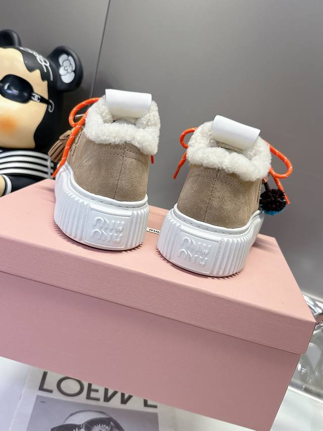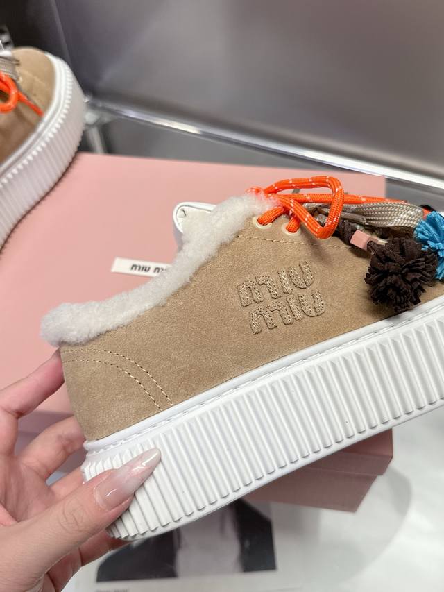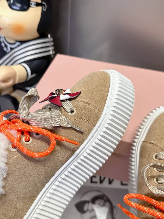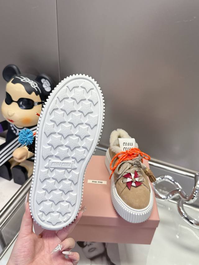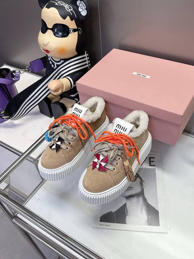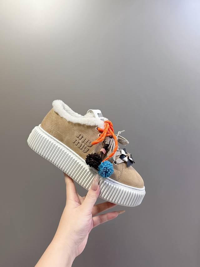 / 工厂p价 女装女鞋 运动原单 配饰花 Miumiu这波秋冬王炸:卡其 棕 杏三色调,真毛里裹脚暖,厚底踩出漫画腿,配饰吊花一缀,甜酷贵气全拿捏~冷天里的“脚边小