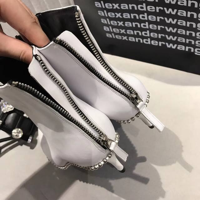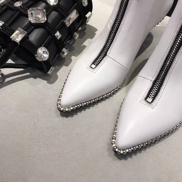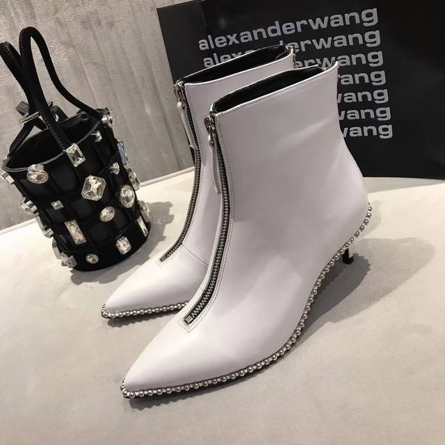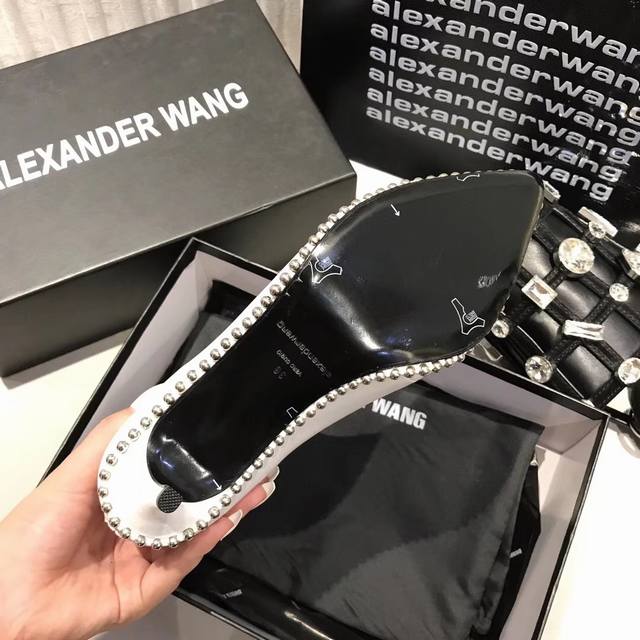 工厂P价 女装女鞋 运动原单 Alexander Wang亚历山大王高品质原版开版!纯钢串珠延条配置高密度意大利进口牛皮大底!原单高档货!时尚界鬼才设计的新颖高跟鞋尖头设计,时尚又带点复古!线性完美!上脚舒适跟脚!整鞋全皮制作.进口小牛皮面,内里羊皮,跟高两种5厘米和9厘米,很稳的跟!完美鞋型走路也不会累!有防水台铆钉35--40码。真皮大底