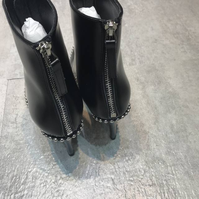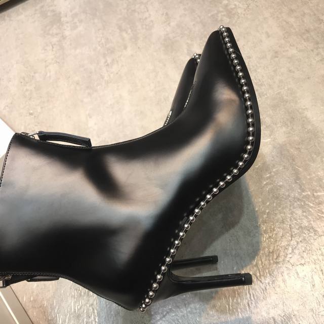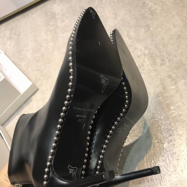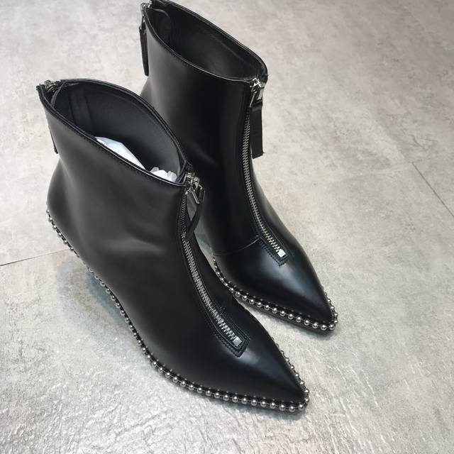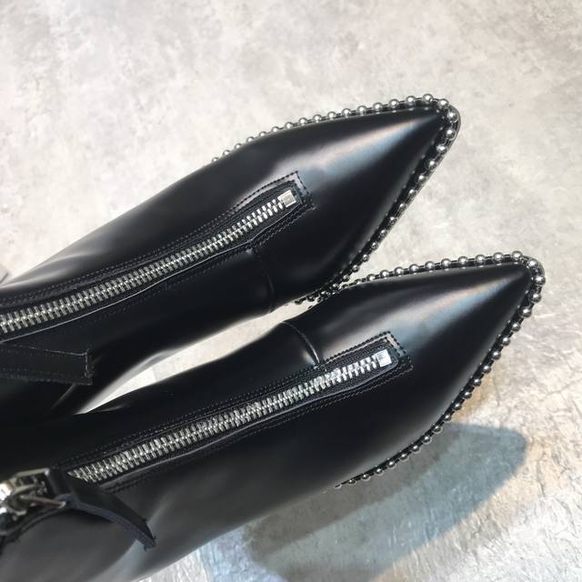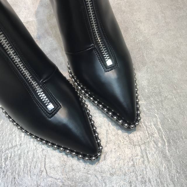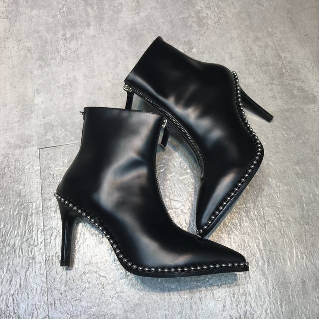 工厂P价 女装女鞋 运动原单 Alexander Wang亚历山大王高品质原版开版!纯钢串珠延条配置高密度意大利进口牛皮大底!原单高档货!时尚界鬼才设计的新颖高跟鞋尖头设计,时尚又带点复古!线性完美!上脚舒适跟脚!整鞋全皮制作.进口小牛皮面,内里羊皮,跟高两种5厘米和9厘米,很稳的跟!完美鞋型走路也不会累!有防水台铆钉35--40码