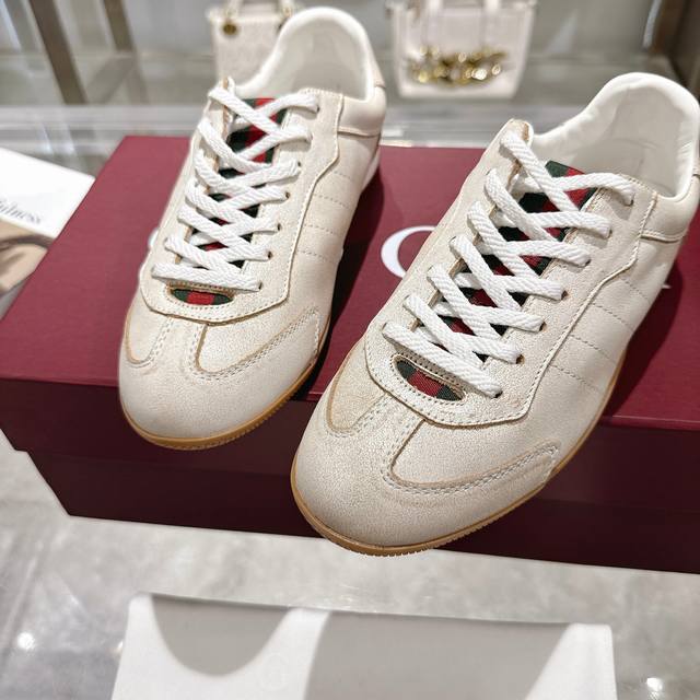 工厂P价 女装女鞋 运动原单 Gg德训鞋,爆款,轻盈设计焕新诠释运动风尚。行动间彰显精致质感。侧边缝线细节增添点睛之笔。黑色牛皮面料,黑色牛皮里,乳胶一体成型垫脚。鞋舌与后跟饰标志性红绿色织带。双色橡胶鞋底。男女同款,女码35-40码。男款:。39-45码。全套包装。
