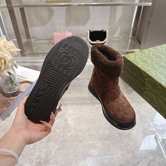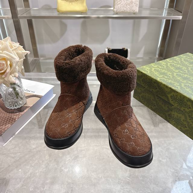 工厂p价 女装女鞋 运动原单 Gg新款女士美利奴羊毛内里靴 这款女士靴采用麂皮精制而成,兼具舒适感与经典传承。柔软的美利奴羊毛内衬带来温暖奢华的穿着体验,而标志