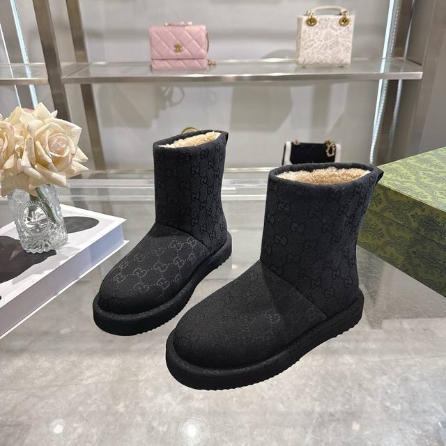 工厂p价 女装女鞋 运动原单 Gg新款女士雪地靴美利奴羊毛内里提花鞋面中筒靴 这款女士雪地靴采用Gg提花布面精制而成,兼具舒适感与经典传承。柔软的美利奴羊毛内衬