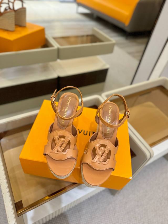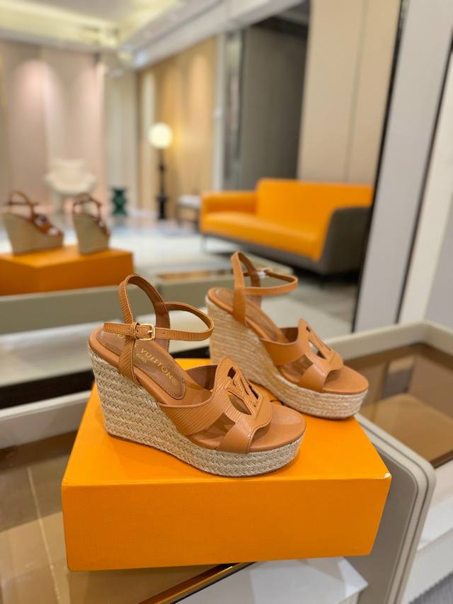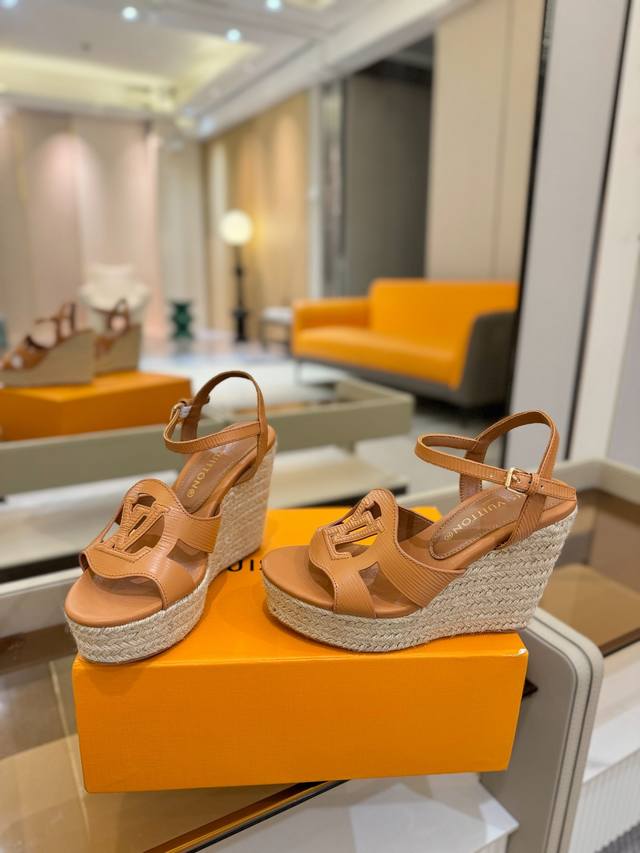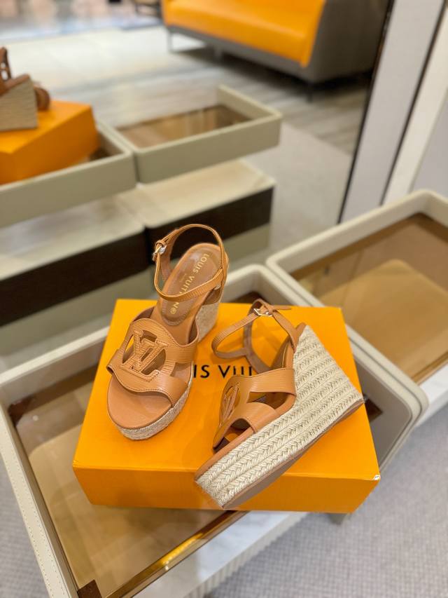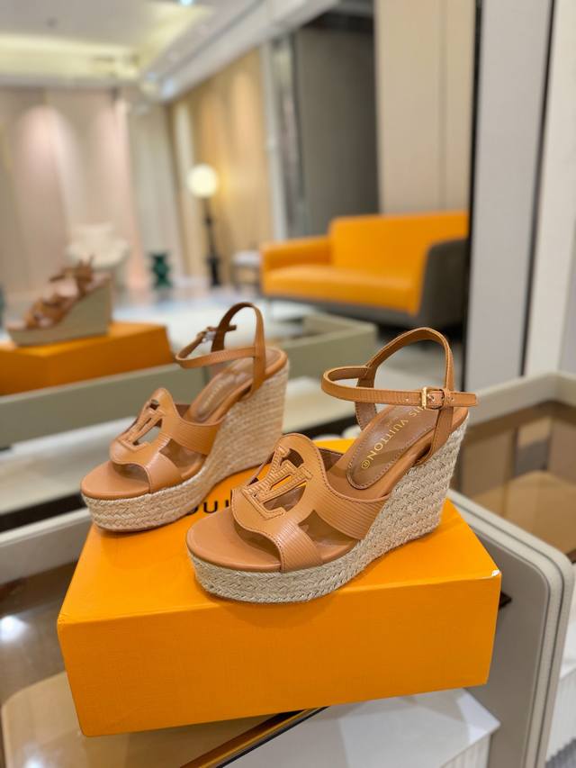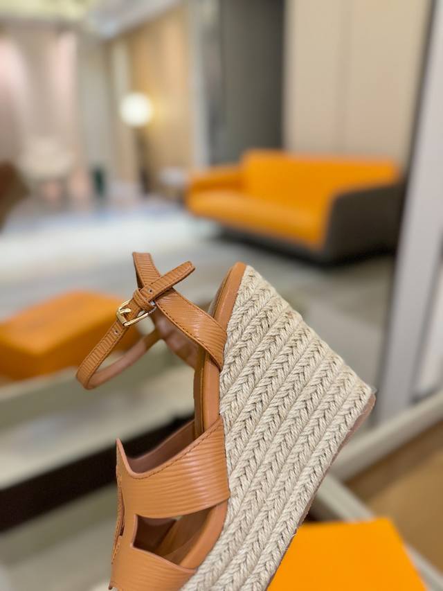 工厂P价 女装女鞋 运动原单 L V 走秀款厚底麻绳凉鞋 香港原版购入一比一开模 今年的款式比去年增加了新原素 显得更为大牌 皮面款采用原版仿旧打蜡牛皮 内里垫脚全羊皮 水台草编技术包裹 鞋面采用订制编制极费工时 跟高:10Cm 水台6Cm 码数:34-42 {34.41.42不予退换}