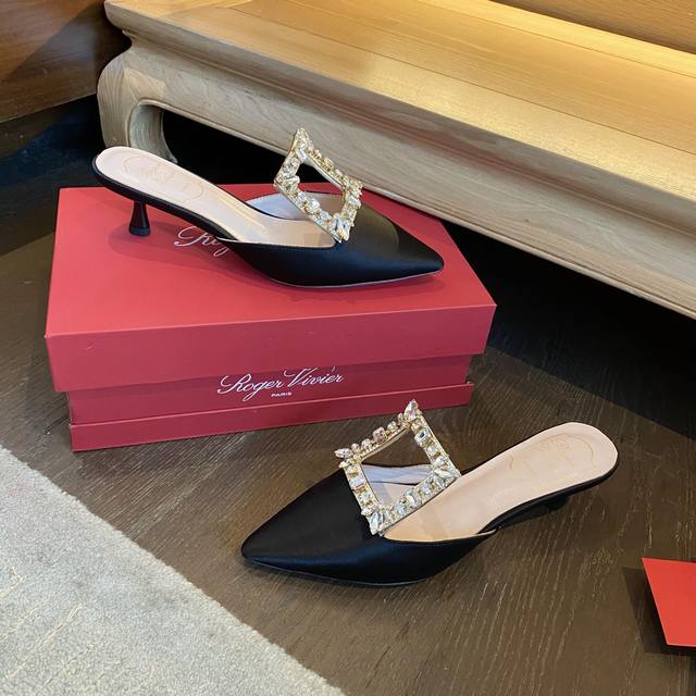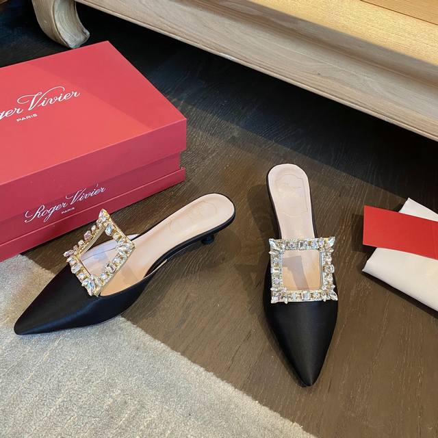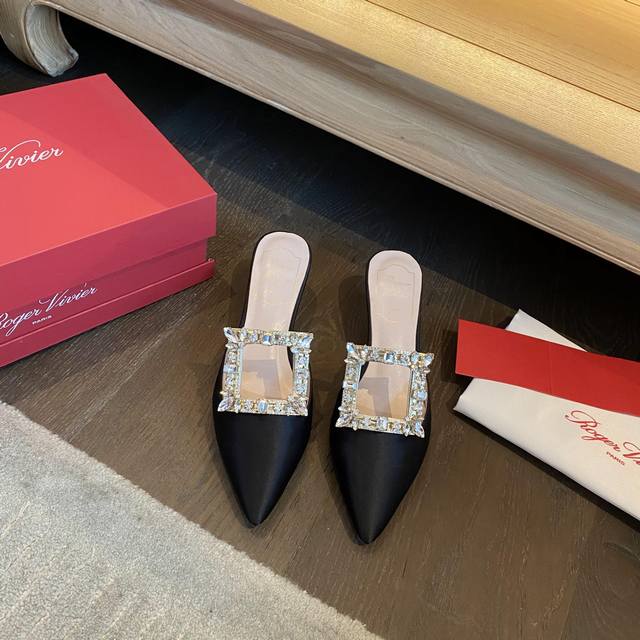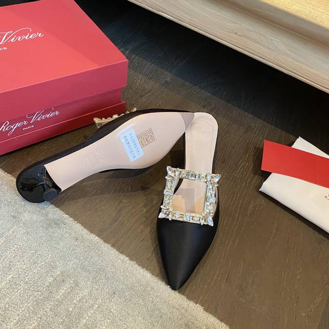 工厂p价 女装女鞋 运动原单 Roger Vivier2025春夏新品走秀新款拖鞋 DDD Broche.Vivier凡尔赛钻扣穆勒鞋 DDD 面料:进口真丝面料 DDD 内裡:昆种浅色羊皮内裡 DDD 跟高:4.5Cm,34-39码.正码 DDD 奢扣:玻璃顶级奥钻. DDD 出厂:意大利真皮底 DDD