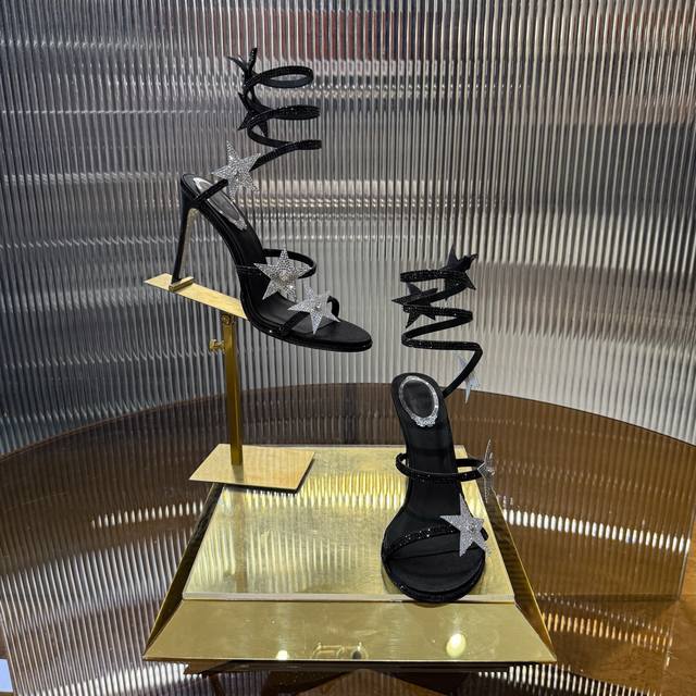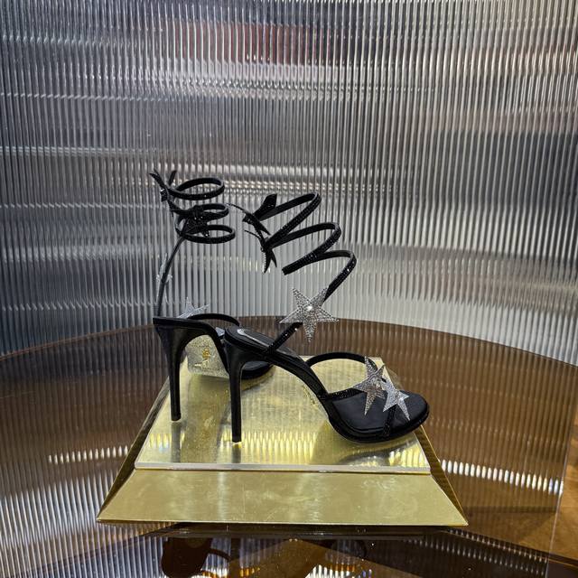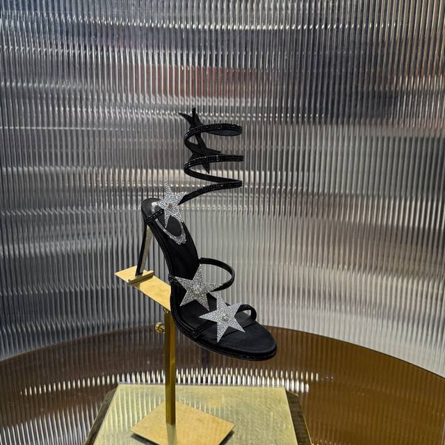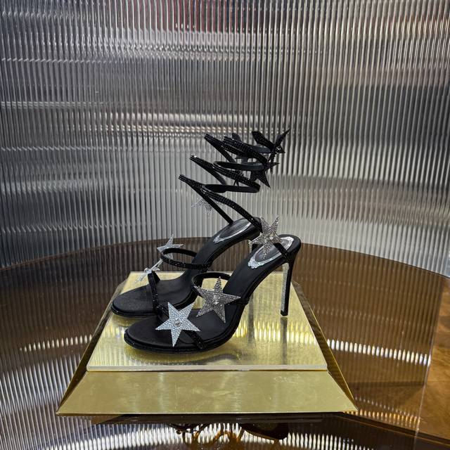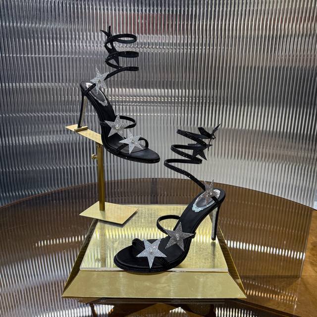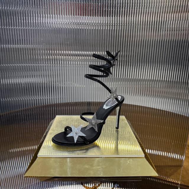 工厂P价 女装女鞋 运动原单R C 2025 Rc Margot系列,原版开发,星光闪闪蛇形五角星缠绕水晶女士凉鞋,标志性螺旋蛇型系带新版,薄纱五角星水钻镶嵌,轻柔栖息于蛇形系带和水晶鞋面上,光彩熠熠,仙气十足 鞋面:进口真丝+施华洛水晶钻 内里:珠光羊皮里 大底:原版一致闪银真皮大底原版开发金色Logo Size:34-43 34.40.41.42.43.订做不退换 Color:4个配色 跟高:约9.5Cm 可订做7.5Cm、及4.5粗跟