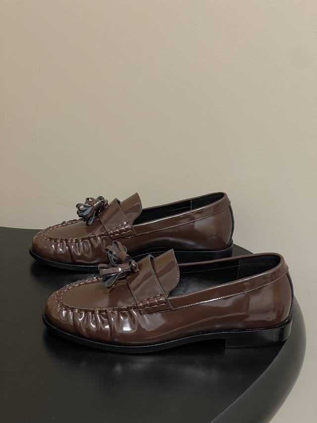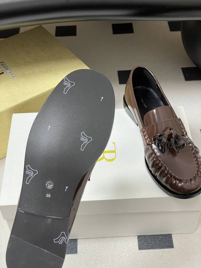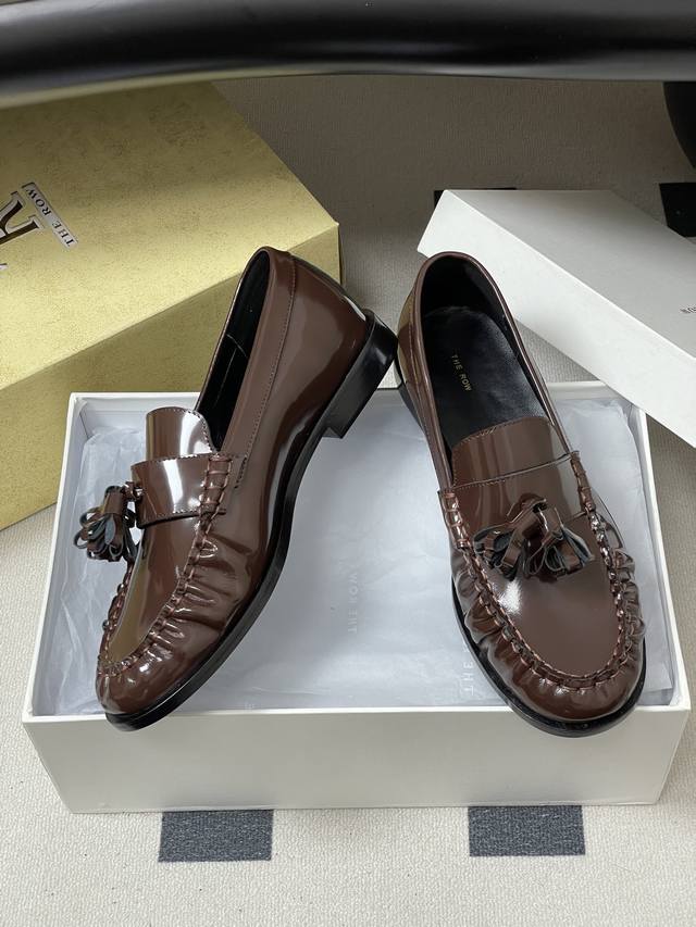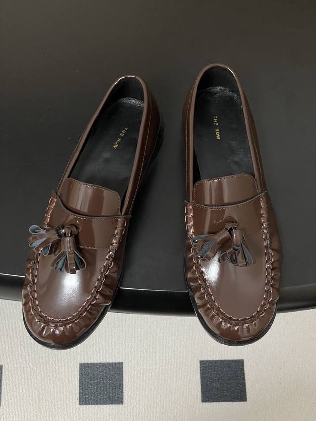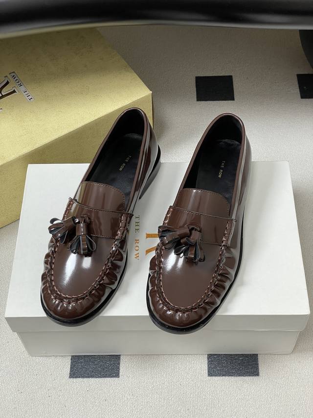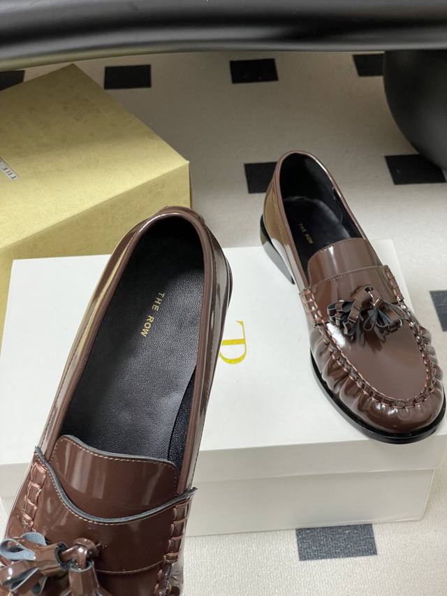 FFF 工厂P价 - DDD The Row 26Fw春夏新款 Tr复古流苏乐福鞋亮面老钱风小皮鞋单鞋 DDD 这双鞋是极简主义与复古情怀的完美共生,亦是The Row 低调即顶奢 的极致表达。仅以同色系真皮流苏点缀鞋头,行走时轻晃摇曳 添一分灵动却不张扬,打破极简的清冷 揉入复古的温柔。以极简廓形复刻复古乐福的慵懒随性,契合当代女性不费力的时髦主张。它可以搭配剪裁利落的羊毛阔腿裤,化身职场里从容笃定的精英。亦可配软糯针织长裙,演绎秋日街头的复古文艺,哪怕是随性的牛仔与白衬衫 DDD 也能被它衬出Old