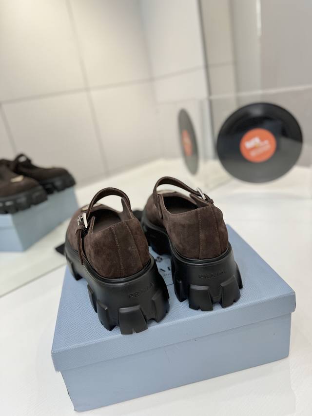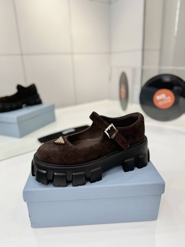 工厂p价 prada玛丽珍鞋 三角扣厚底小皮鞋乐福鞋,全套齐 这款鞋鞋面配有饰带和金属搭扣 涂珐琅金属三角形徽标,复古时髦前卫的轮齿厚底鞋底搭配牛皮鞋面让整双鞋