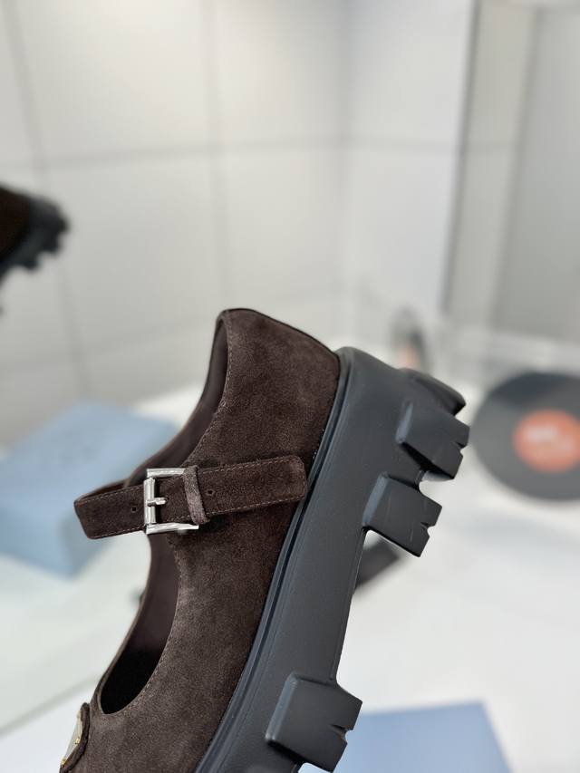 / 工厂p价 prada玛丽珍鞋 三角扣厚底小皮鞋乐福鞋,全套齐 这款鞋鞋面配有饰带和金属搭扣 涂珐琅金属三角形徽标,复古时髦前卫的轮齿厚底鞋底搭配牛皮鞋面让整双鞋