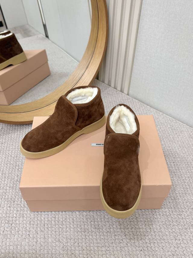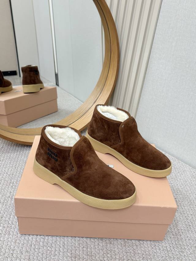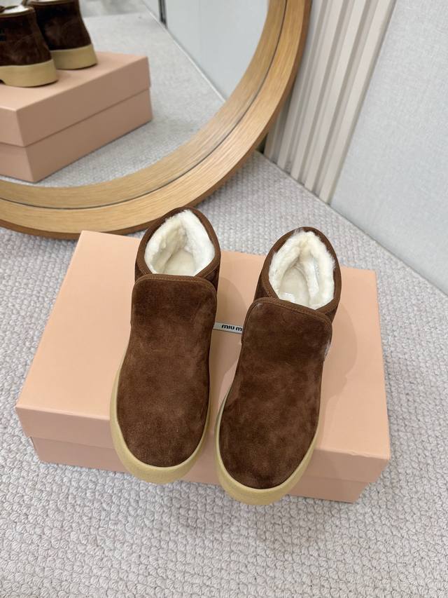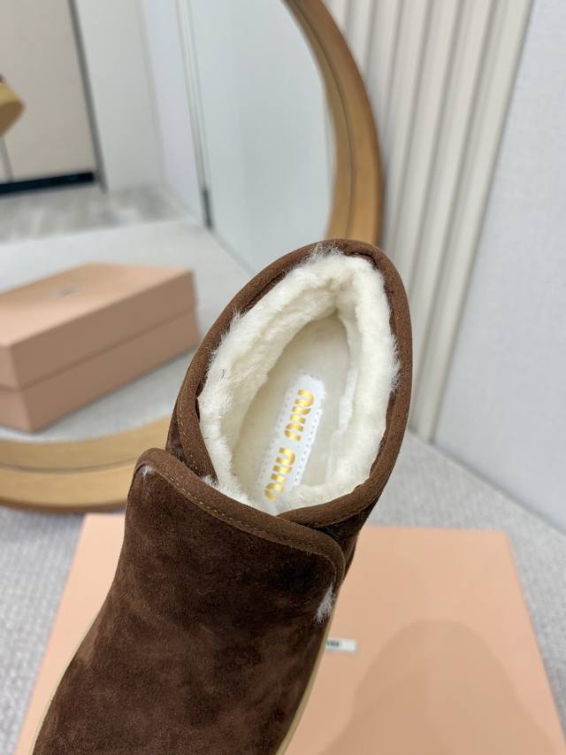 工厂p批 女装女鞋 运动原单 DDD Miumiu.秋冬走秀新款纯羊毛雪地靴 冬日甜酷少女的温暖选择雪地靴甜酷新高度,从造型到细节,把少女感与保暖性拿捏刚好,丝光牛反绒面料自带细腻高级感,鞋口羊毛绒边蓬松柔软,视觉上就很“暖”,还能修饰脚踝线条,让小腿看起来更纤细。无论是日常出街还是冬日通勤,都很合适 DDD 码数:35-40 40订做 DDD