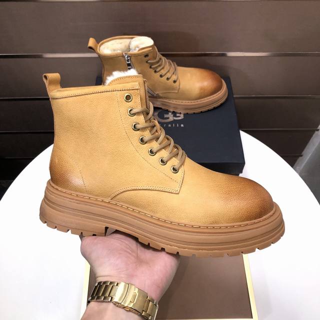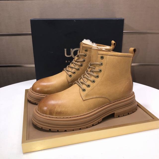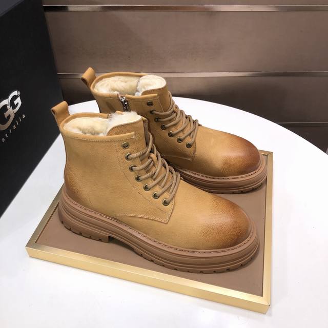 工厂p批 Ugg 全真羊毛内里 请注意 原单品质 比较毛料的厚度爆款马丁靴 来自澳洲温暖奢侈品牌男鞋,官网同步、贝克汉姆男款..,采用进口头层打蜡牛皮制作,鞋头打蜡 澳洲真羊毛绒里 精心缝制而成..进口橡胶马丁靴大底 舒适、柔软、耐磨 质量真心赞..做工精湛,一看就爱不释手。码数39-44 DDD