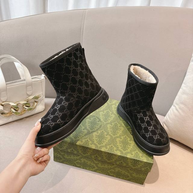 爆款 Gg 新款女士及踝靴羊毛靴这款 Cruise 靴子既稳定又奢华。Gg 图案和其他细节向品牌的根源致敬。 DDD 这款雪地靴鞋面采用牛皮反绒皮压纹Gg,内里羊毛一体,鞋垫采用塑料Q弹pu羊皮毛一体,脚感舒适又保暖,橡胶发泡大底防滑耐磨,码数35一42码, DDD