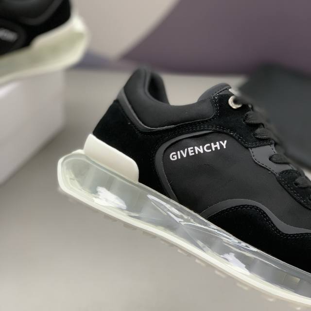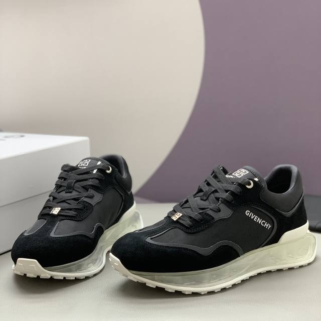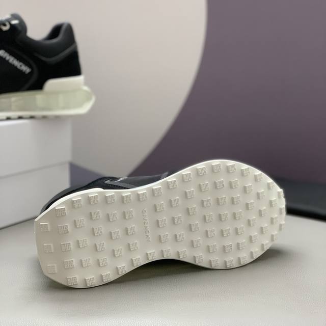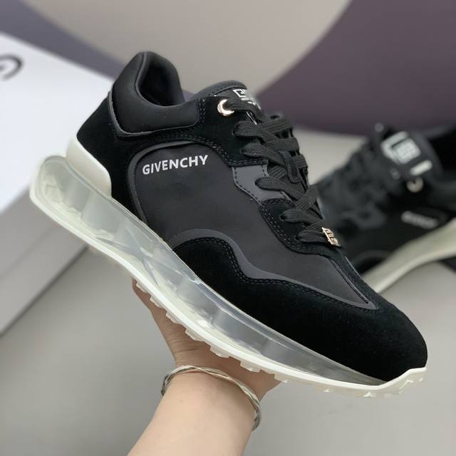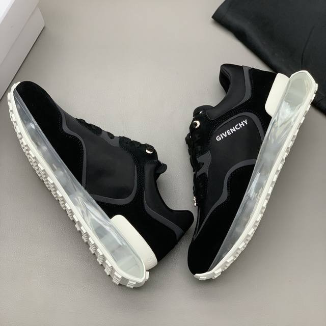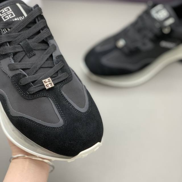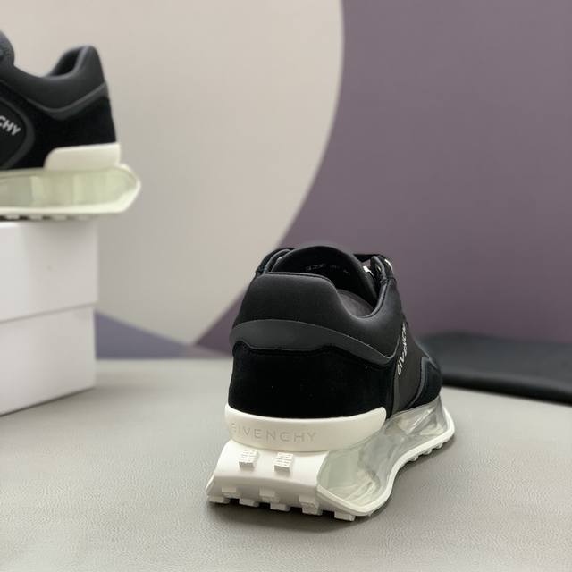 男士低帮休闲鞋 -采用黑色镂空皮革材质,鞋舌点缀4G Logo,侧面饰以Logo字母印花 -复古设计,轻盈透明和白色科技鞋底。 码数:39-45