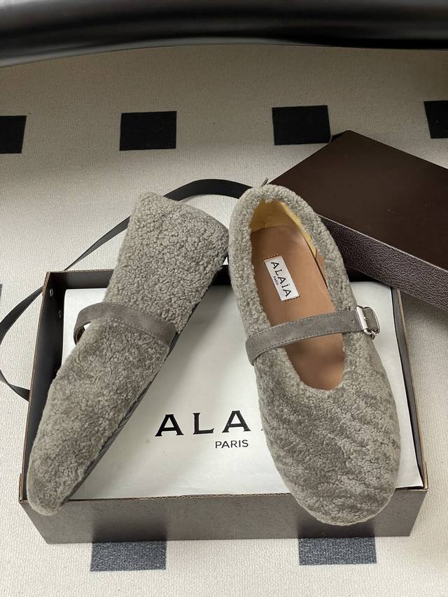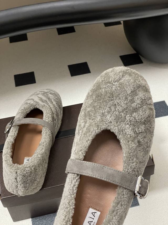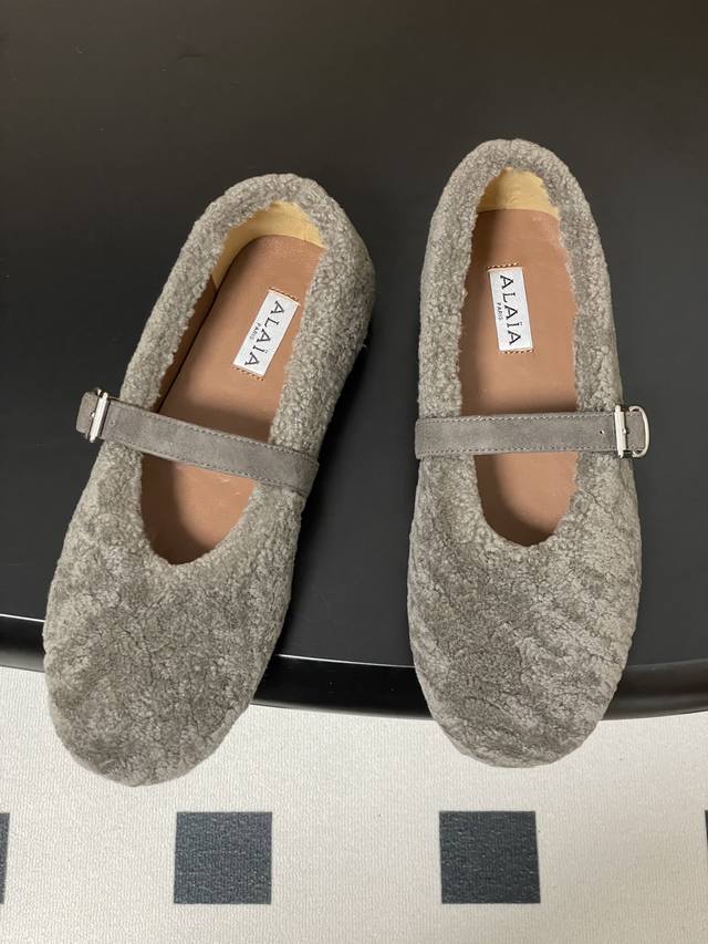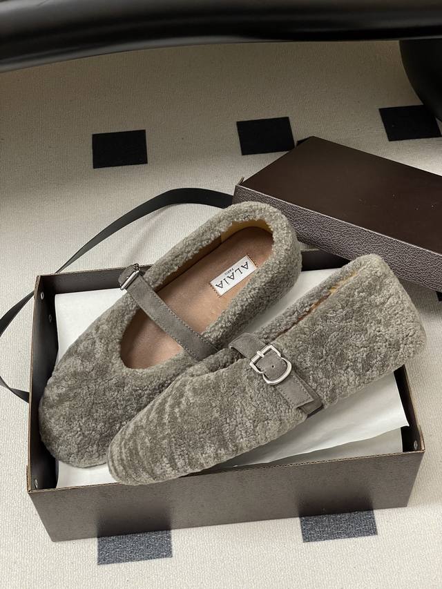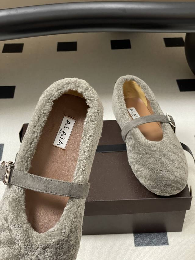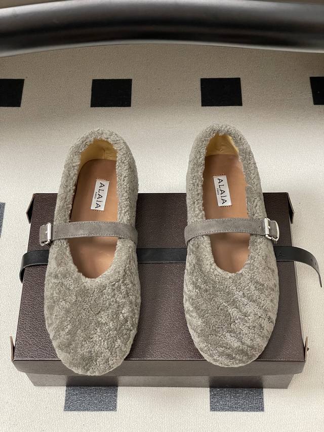 皮带盒20下单备注 默认普通盒 25Fw秋冬新款 Alaia阿莱亚 羊羔毛法式芭蕾舞鞋羊毛面玛丽珍平底单鞋老钱风 原本更具有柔美浪漫气息的芭蕾平底鞋采用麂皮绒鞋面,传统的芭蕾风格具有了更多施展的可能性,也更能与当代时尚结合。 女性气质十足的芭蕾元素可不只一种风格,刚柔并济,既优雅又有力量,才是芭蕾舞鞋最好的打开方式。每一处细节都彰显着法式精致。 将可爱与显腿细完美融合 让你在寒冷的冬日 既能享受温暖 又能散发迷人魅力 面采用柔软细腻的麂皮绒 触感如同冬日里的暖阳般温暖 羊羔毛内里 不仅触感柔软 更将冬日氛