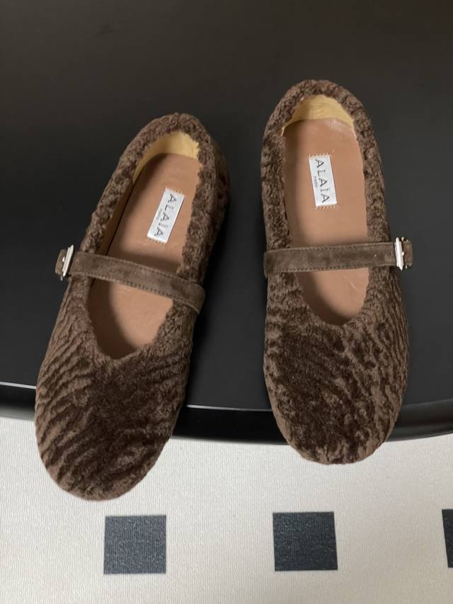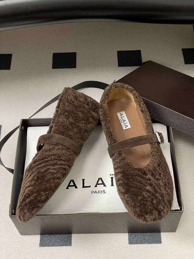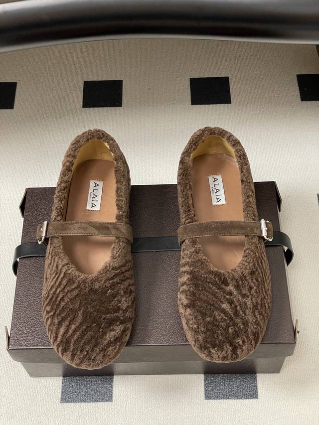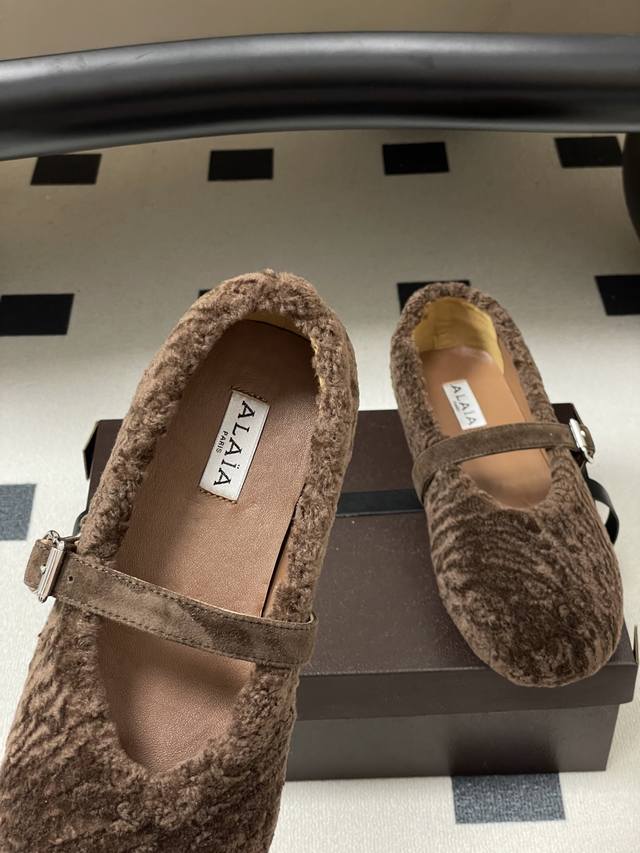 皮带盒20下单备注 默认普通盒 25Fw秋冬新款 Alaia阿莱亚 羊羔毛法式芭蕾舞鞋羊毛面玛丽珍平底单鞋老钱风 原本更具有柔美浪漫气息的芭蕾平底鞋采用麂皮绒鞋面,传统的芭蕾风格具有了更多施展的可能性,也更能与当代时尚结合。 女性气质十足的芭蕾元素可不只一种风格,刚柔并济,既优雅又有力量,才是芭蕾舞鞋最好的打开方式。每一处细节都彰显着法式精致。 将可爱与显腿细完美融合 让你在寒冷的冬日 既能享受温暖 又能散发迷人魅力 面采用柔软细腻的麂皮绒 触感如同冬日里的暖阳般温暖 羊羔毛内里 不仅触感柔软 更将冬日氛