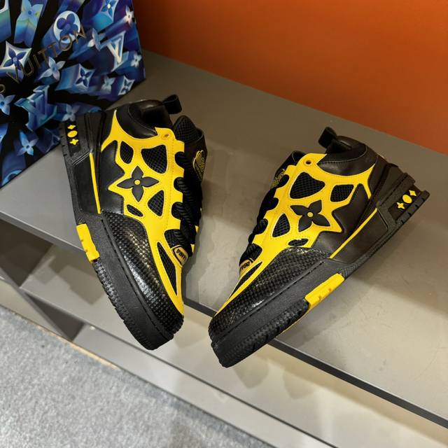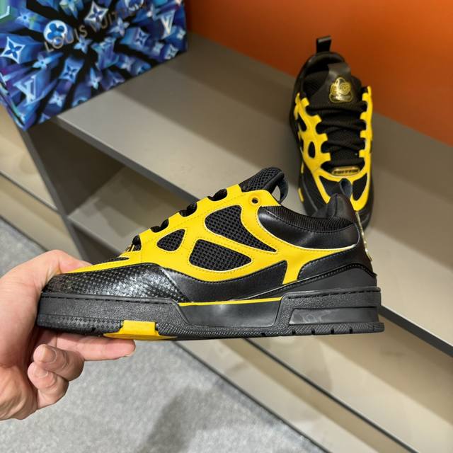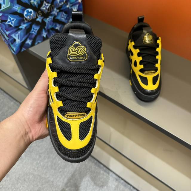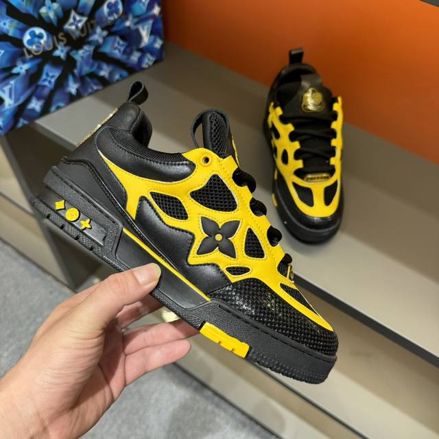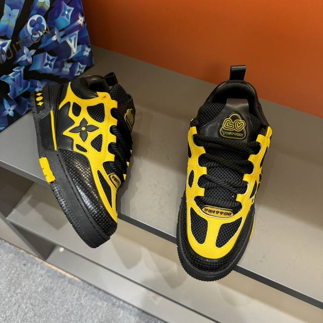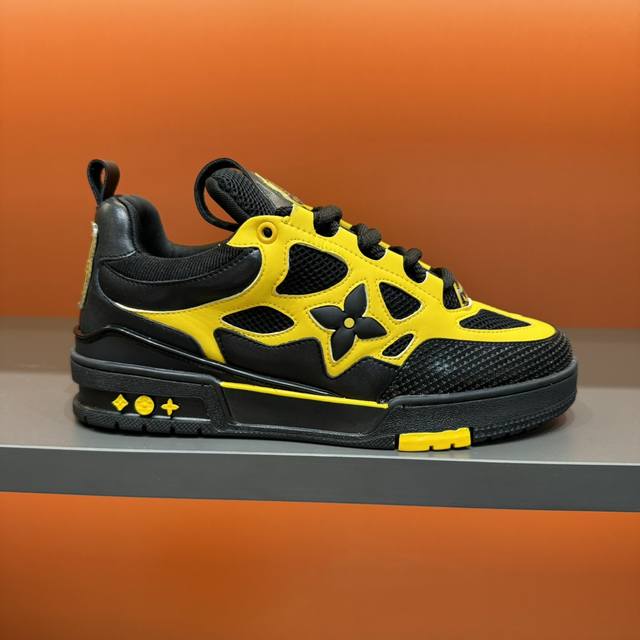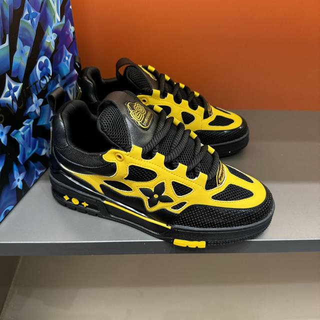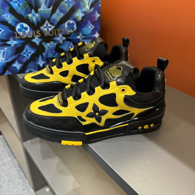 码数38-45 L V Sk8 23年春夏新款,全新面包鞋型,鞋帮上以皮革打造了L V经典花卉标志,鞋型整体为夸张的面包形态,十分吸睛。高饱和的鲜活颜色,与L