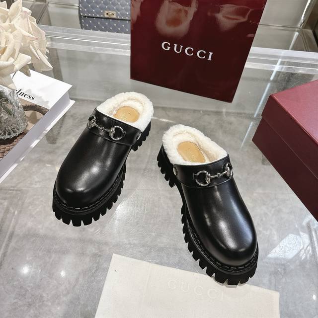 秋冬新款女性羊羔毛穆勒鞋配马衔扣 Horsebit向该品牌的马术历史致敬,多年来它已成为一个既具有历史意义又具现代感的象征。这里,它定义了这款反绒牛皮制作的女性