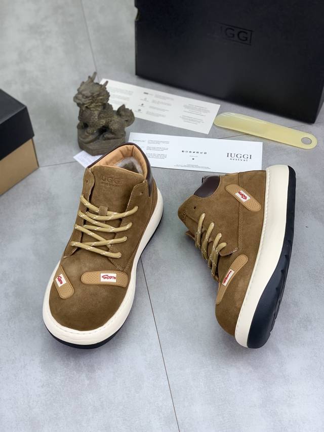 调工厂p价 男装男鞋 运动原单上新 Iuggi 冬季Q版丑萌创口贴大黄靴男潮牌磨砂真皮马丁靴高帮厚底大头鞋 原创设计师翘头靴 冬季新款复古男鞋 潮流时尚 厚底面