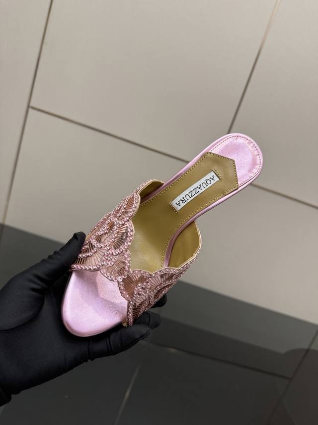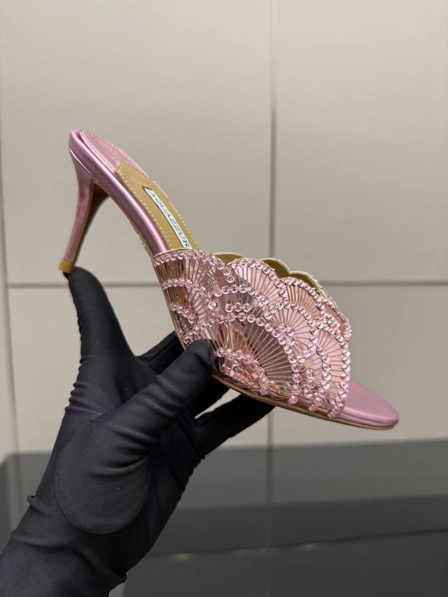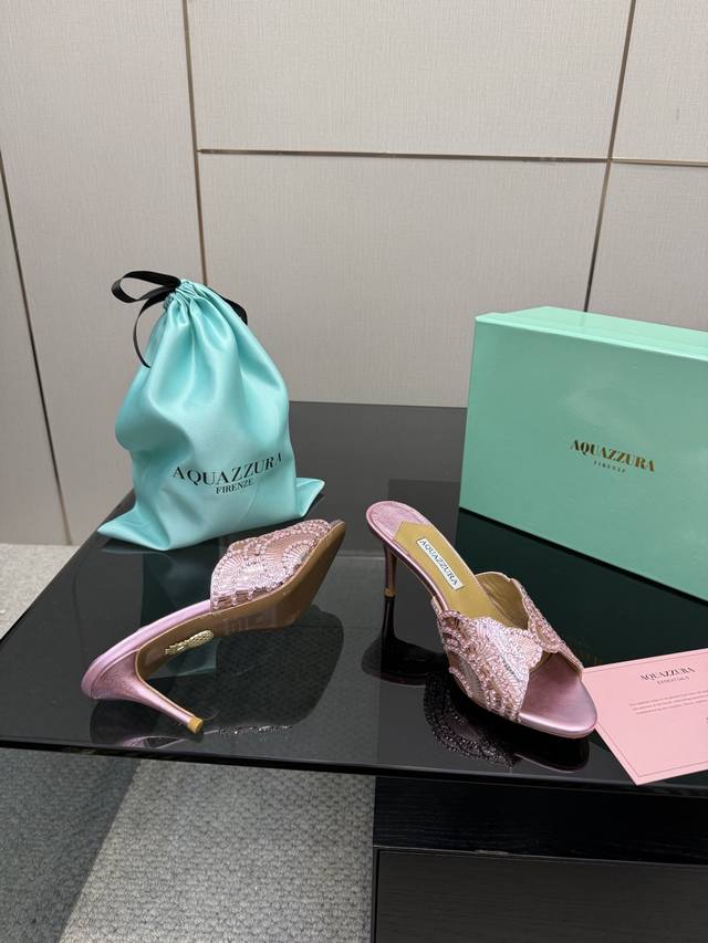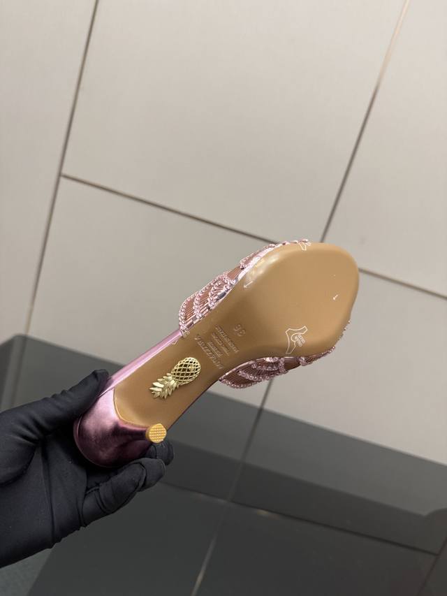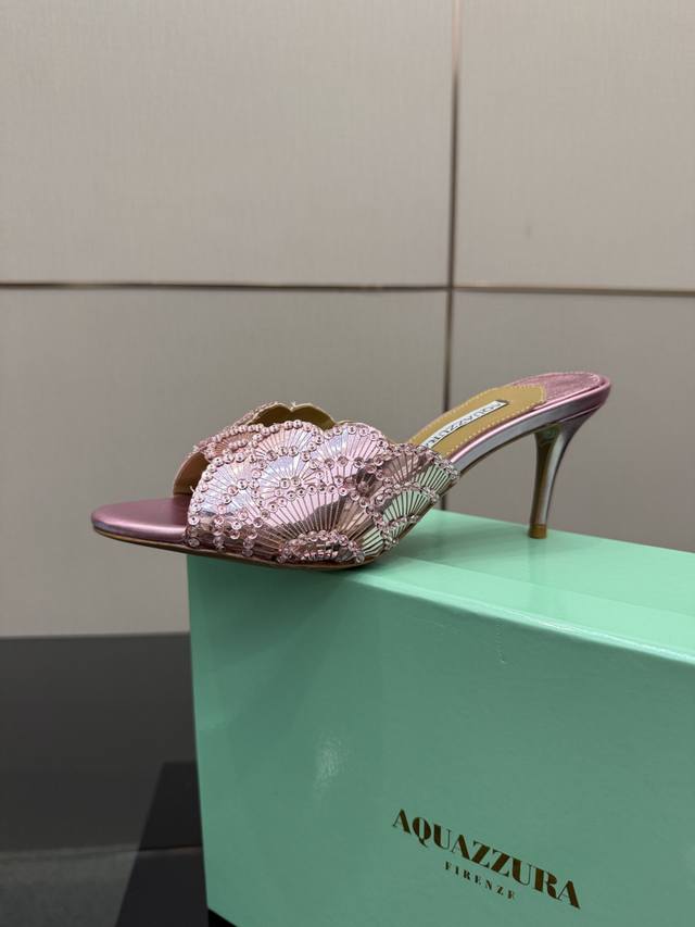 Aquazzura大菠萝亮片装饰激光高跟鞋 2025春夏最新款蝴蝶装饰粗跟凉鞋 上脚超级有气质 既简洁又时髦 太闪太美啦 美出出新高度! 交叉设计,时尚感满满