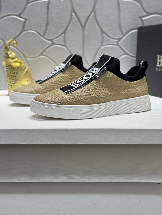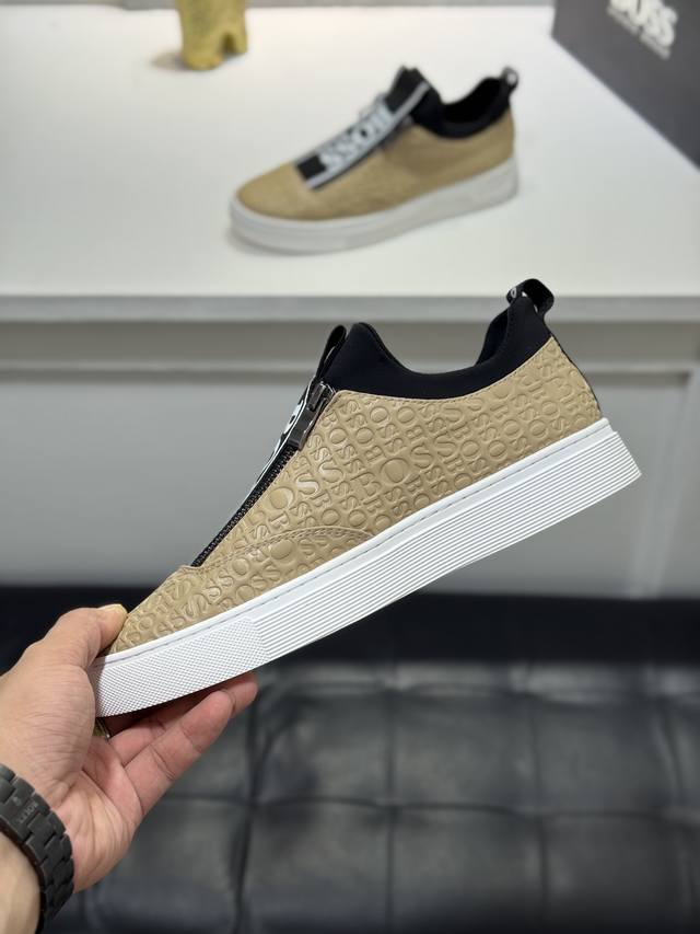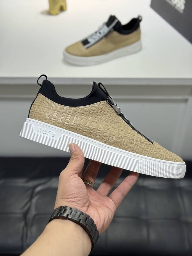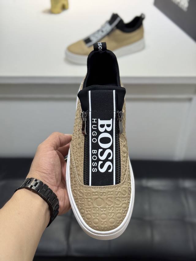 Bos* 男士精品 Boss 休闲男鞋,以经典的一脚蹬设计,成为永不落幕的时尚宠儿,经典的休闲造型。采用牛皮压纹,两边拉链设计,内里羊里品牌专用大底,橡胶耐磨超
