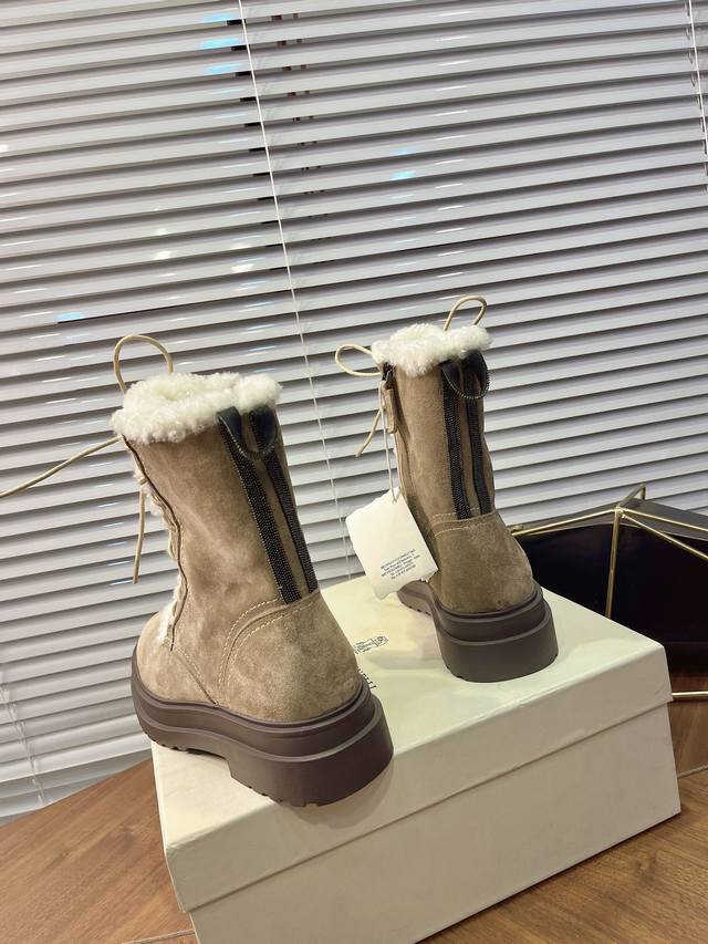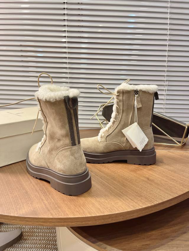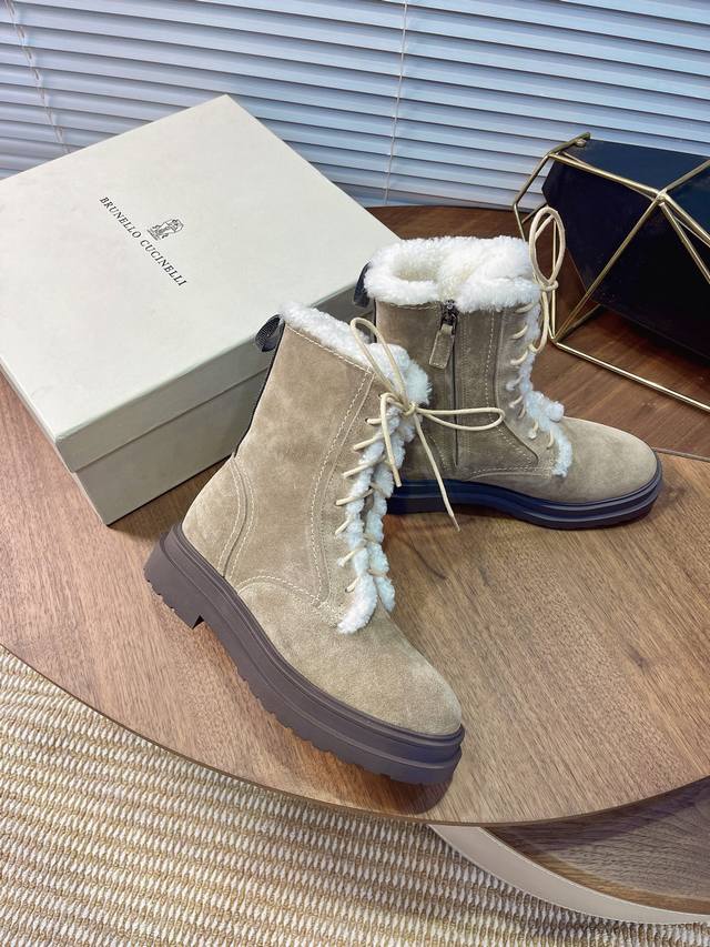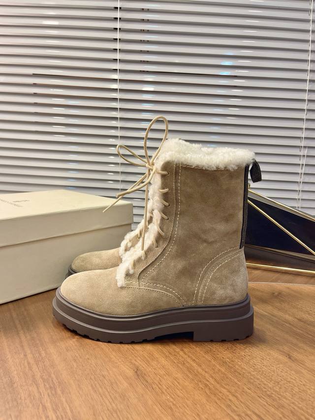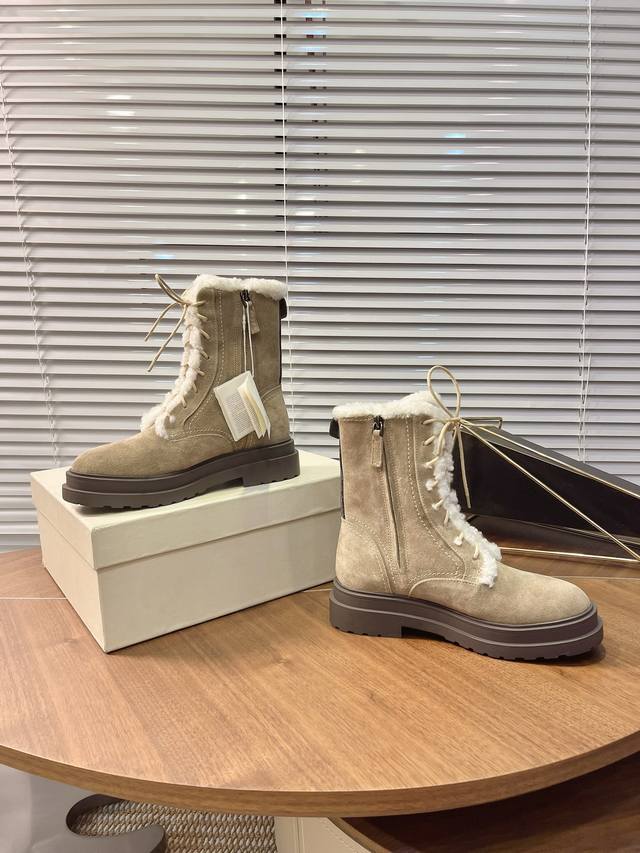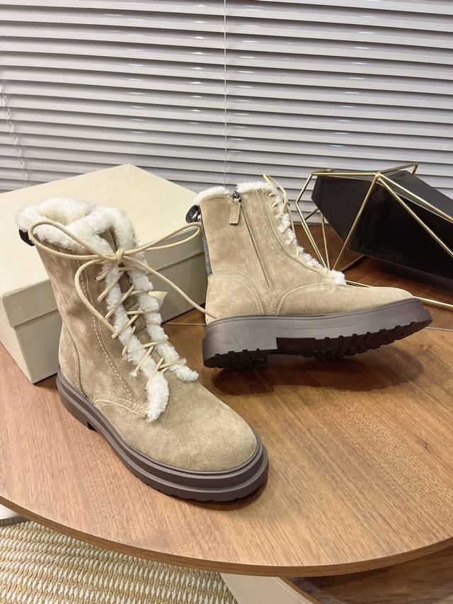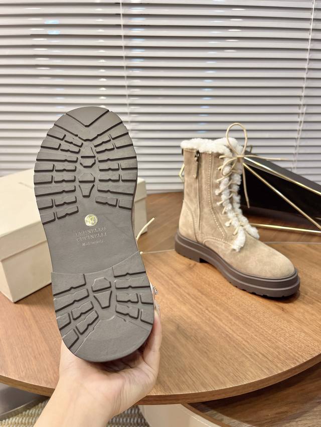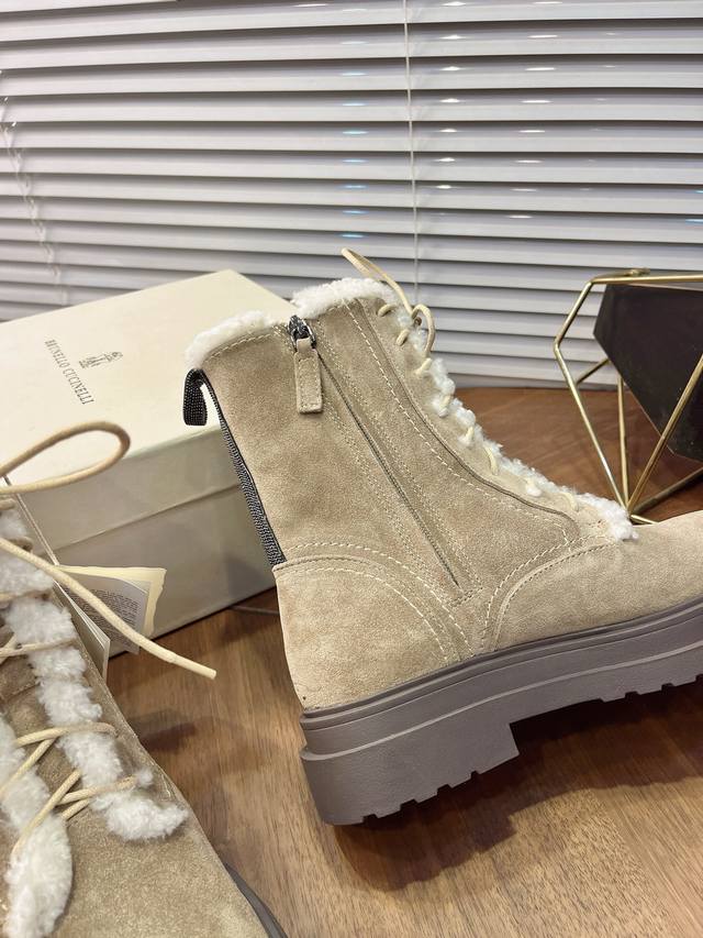 Brunello Cucinell布鲁奈罗库奇内利 25S早秋新款 厚底系带绒里马丁靴 超级温柔的绒面颜色呀,鞋面采用翻毛皮牛反绒做出质感效果,整体温柔舒适氛围