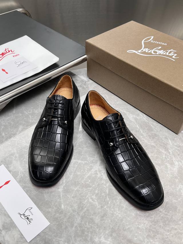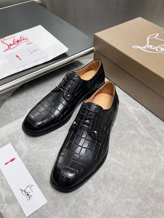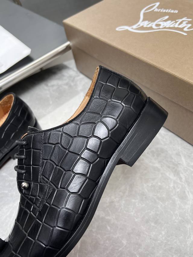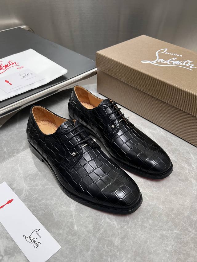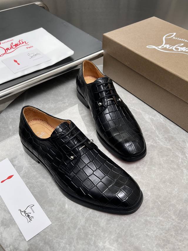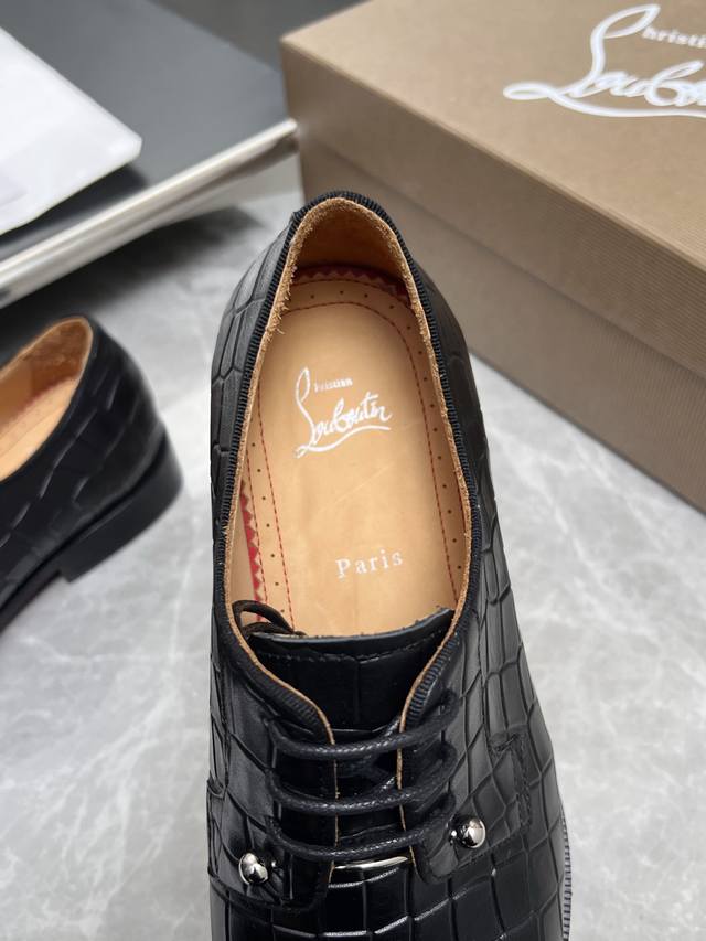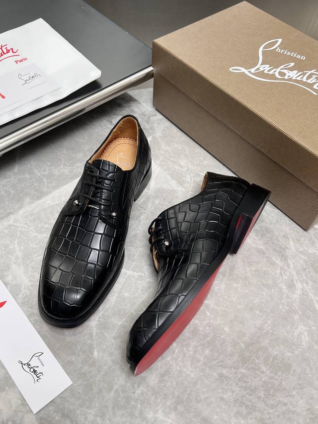 Cl 新品男士正装鞋德比鞋鞋 Christia* Loubouti* 红底鞋 红底奢雅,重塑休闲正装的格调边界 在材质选择上极尽创新,通过不同材质的碰撞营造层次丰富的视觉与触觉体验! 采用顶级小牛皮 亮面漆皮 拼接科技织物撞色制成 鞋面拼接采用手工缝合工艺,针脚细密均匀, 以方头乐福鞋型为基础,线条利落大气,契合男士穿搭的硬朗感;鞋面处点缀金属铆钉饰件,为经典乐福鞋注入个性细节,打破休闲鞋款的平庸感,让“低调奢华”有了具象表达。从鞋内的原色 红色牛皮衬里到辨识度拉满的红色鞋底,“红底”不仅是品牌的视觉标识
