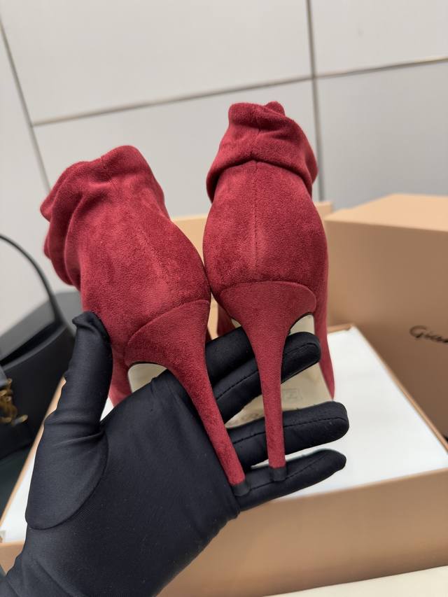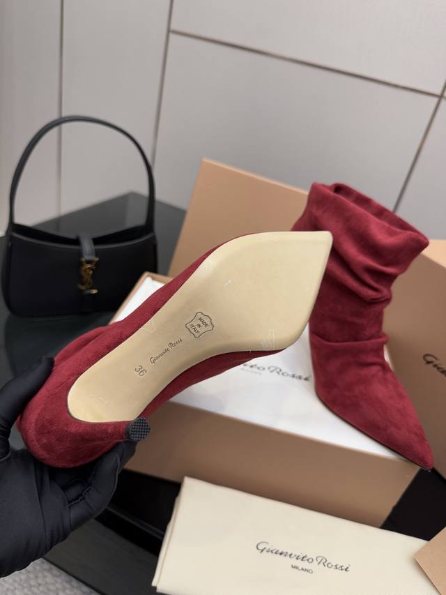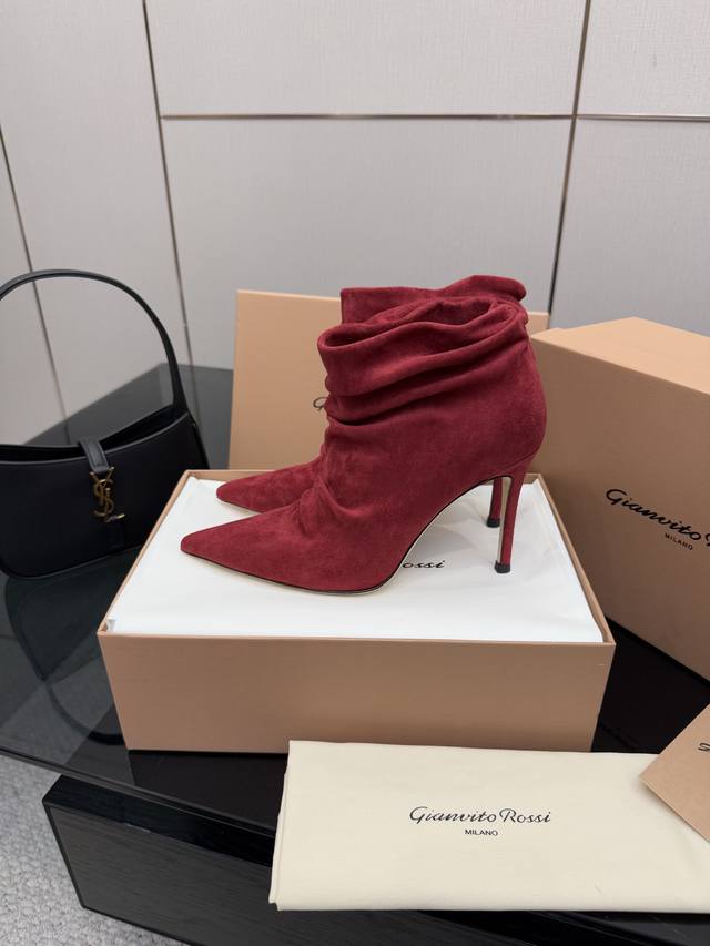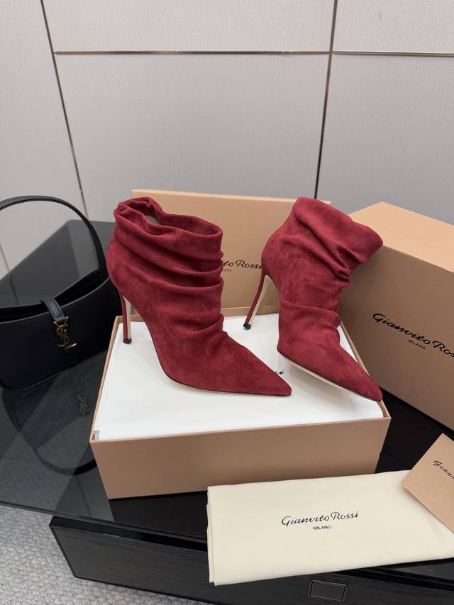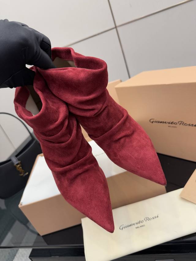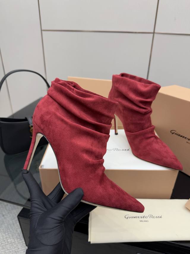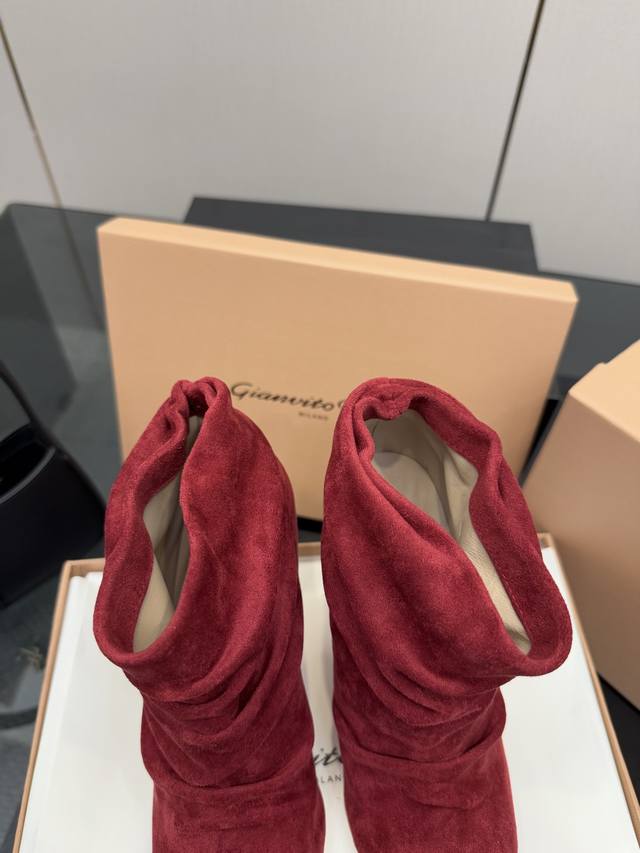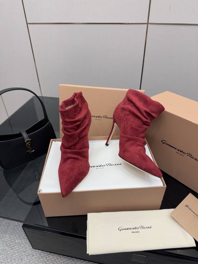 / Gianvito Rossi褶皱高跟短靴,米色羊猄绒皮面料,尖头设计显腿长,褶皱靴筒修饰小腿曲线。全新带盒,跟高约9.5Cm,内里羊皮,意大利真皮大底,舒适好走