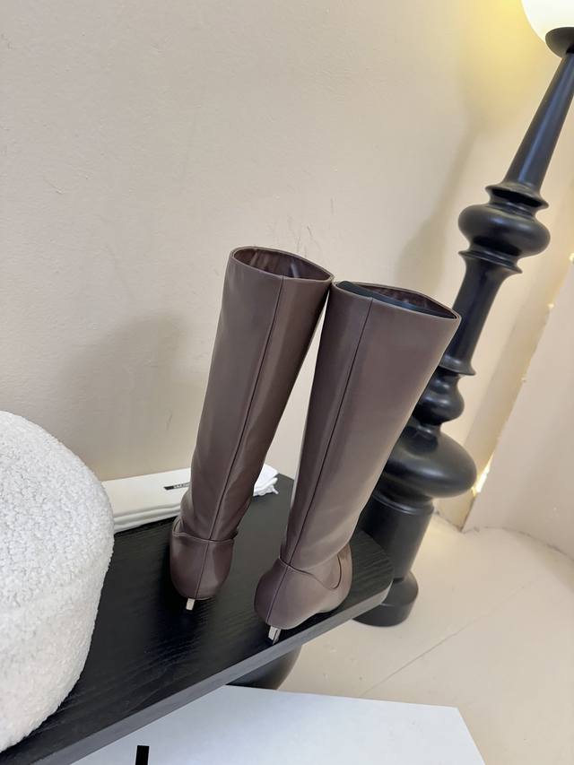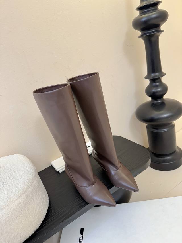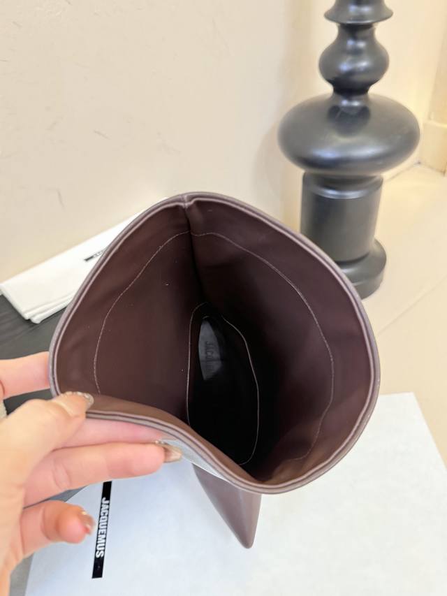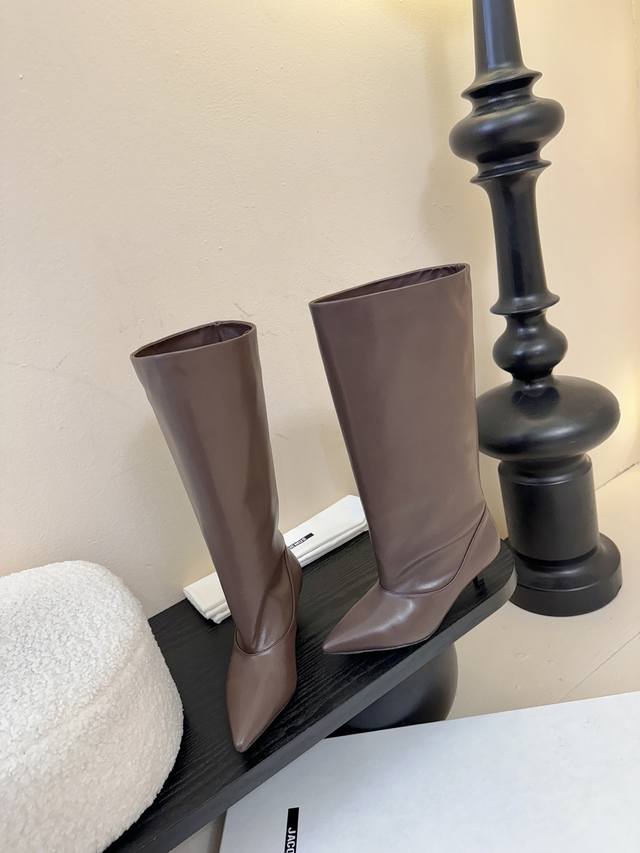 Jacquemus 新品靴 黑色长靴界的“时髦尖子生” 利落尖头+小猫跟 大靴筒太鲨我 气场直接拉满 走哪都是焦点~ 鞋面:进口麂皮.牛皮 垫脚:进口小羊皮 大