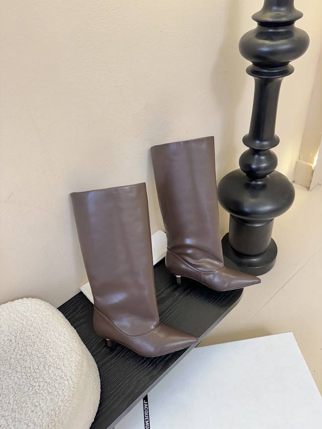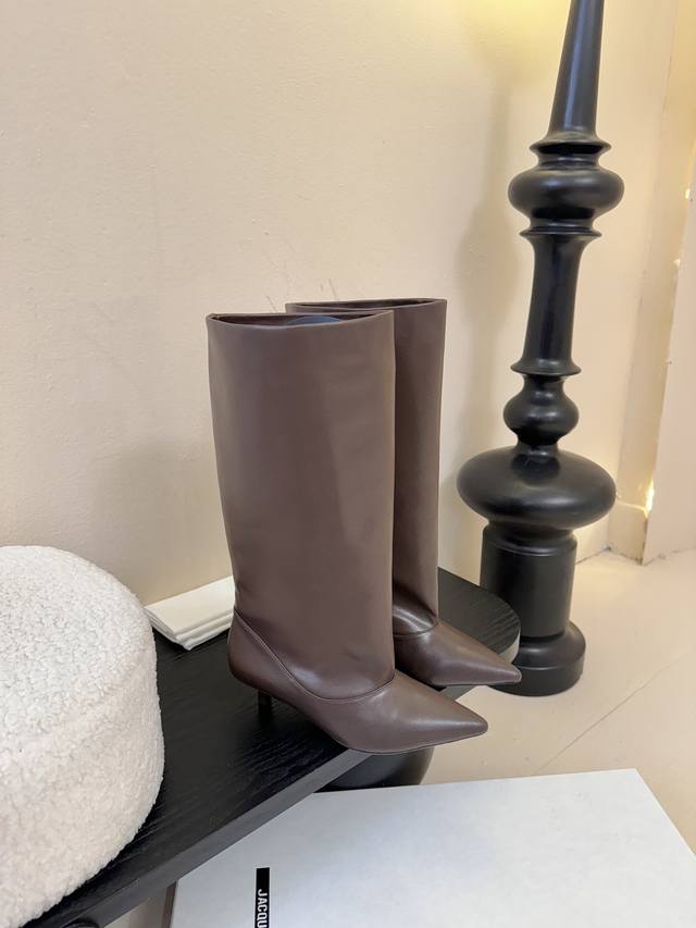 / Jacquemus 新品靴 黑色长靴界的“时髦尖子生” 利落尖头+小猫跟 大靴筒太鲨我 气场直接拉满 走哪都是焦点~ 鞋面:进口麂皮.牛皮 垫脚:进口小羊皮 大