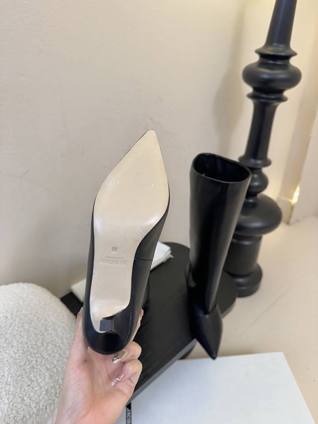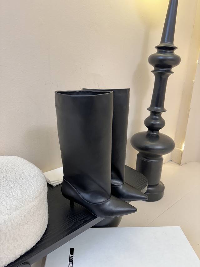 Jacquemus 新品靴 黑色长靴界的“时髦尖子生” 利落尖头+小猫跟 大靴筒太鲨我 气场直接拉满 走哪都是焦点~ 鞋面:进口麂皮.牛皮 垫脚:进口小羊皮 大