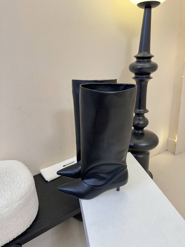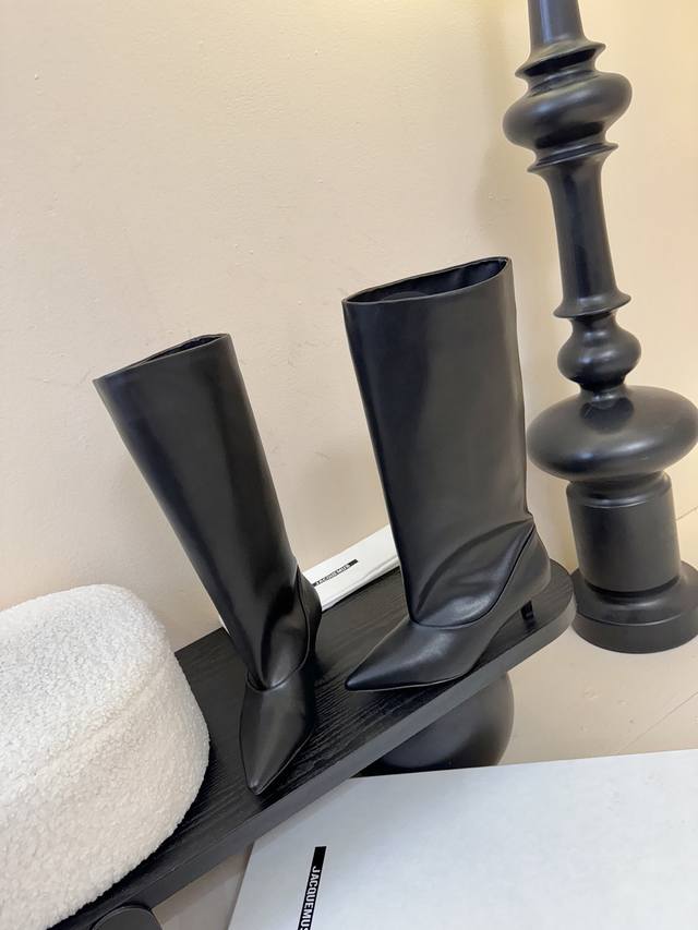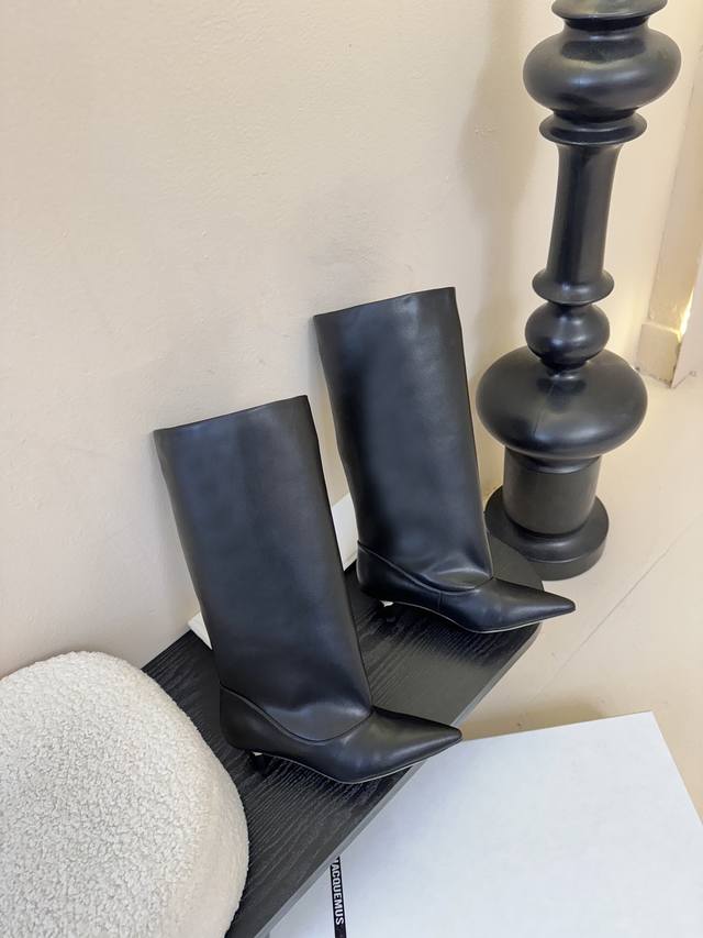 Jacquemus 新品靴 黑色长靴界的“时髦尖子生” 利落尖头+小猫跟 大靴筒太鲨我 气场直接拉满 走哪都是焦点~ 鞋面:进口麂皮.牛皮 垫脚:进口小羊皮 大底:进口真皮大底 跟高:4.5Cm Size:35-39 40.41定