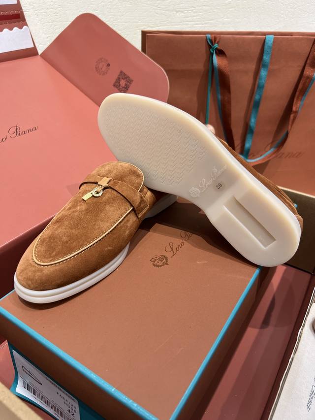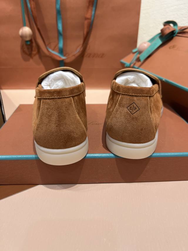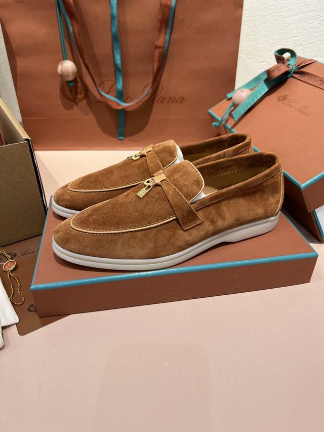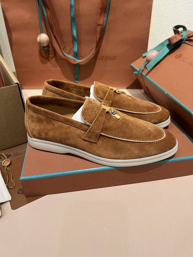 Loro piana 男女同款 Lp经典舒适休闲的软皮平地鞋,采用柔软的无衬里绒面牛皮革制作,浅色橡胶鞋底,是Loro piana鞋履共有的休闲特色,鞋面前部饰