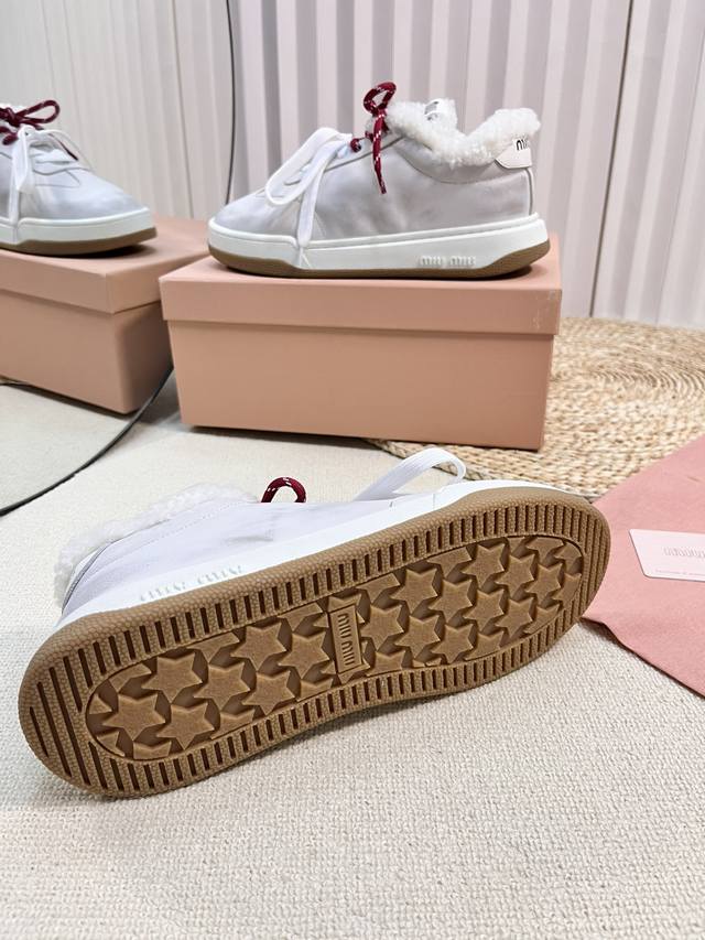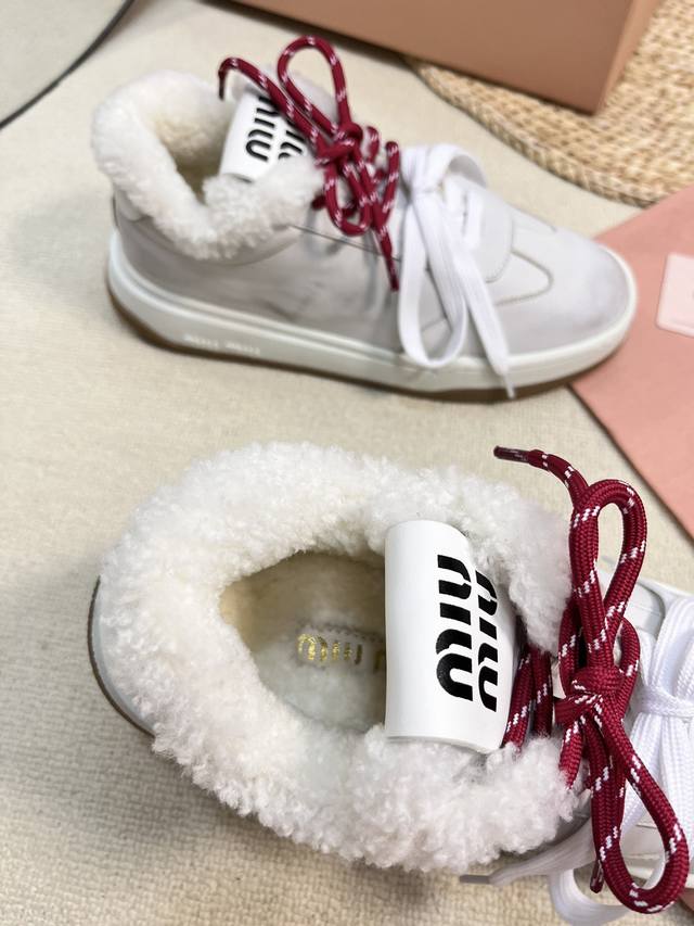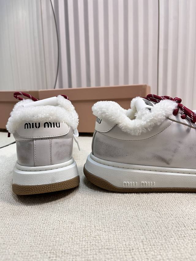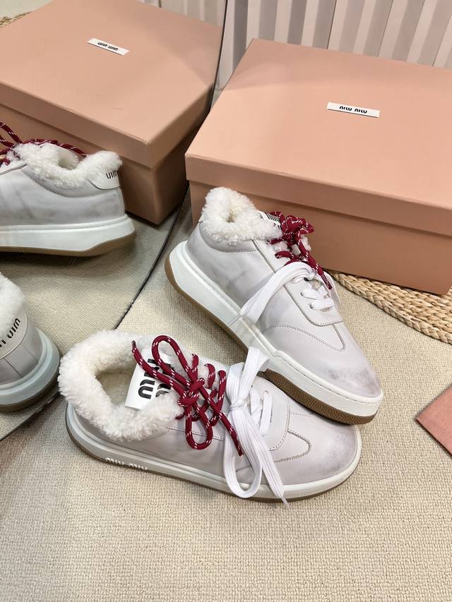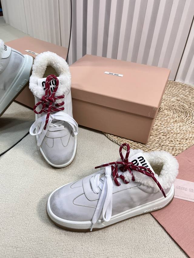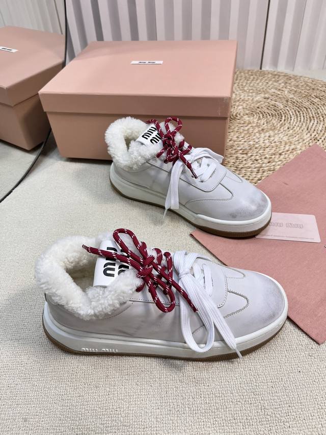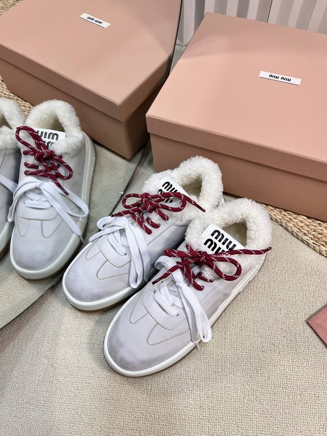 Miu Fw24 New Arrival~Miu家24秋冬新款休闲板鞋 DDD 小红书种草推荐的一款,全羊毛内里非常的舒适,双色绑带潮流设计复古擦色做旧! DDD 丝光牛反绒鞋面 做旧小牛皮,皮毛一体内里,原版Tpu抽真空厚底 DDD Size 35-41 40.41 订做 DDD