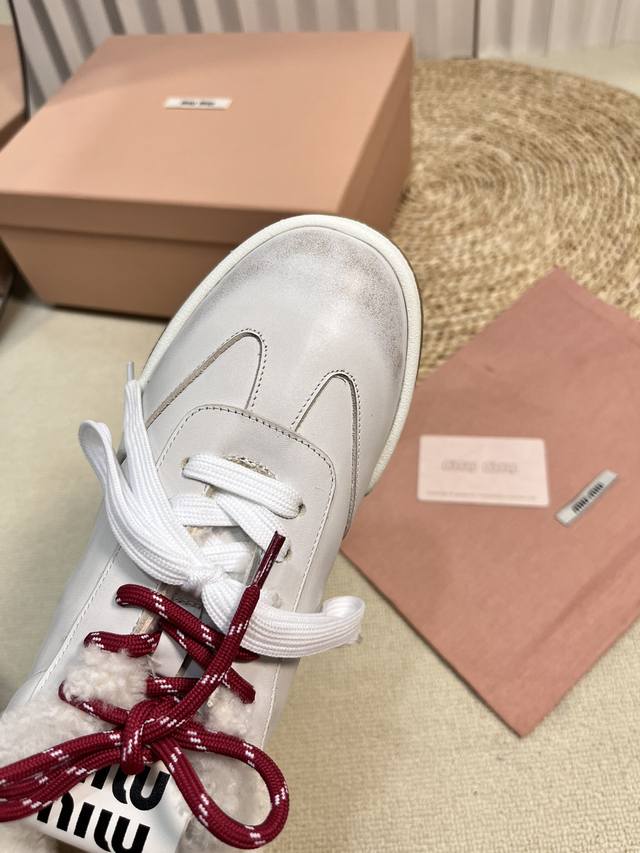 Miu Fw24 New Arrival~Miu家24秋冬新款休闲板鞋 小红书种草推荐的一款,全羊毛内里非常的舒适,双色绑带潮流设计复古擦色做旧! 丝光牛反绒鞋