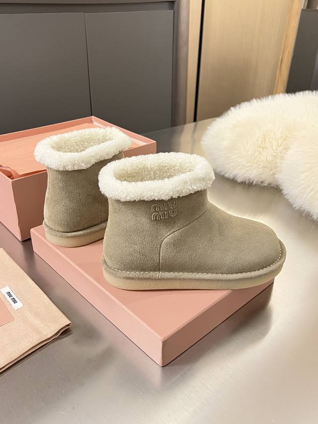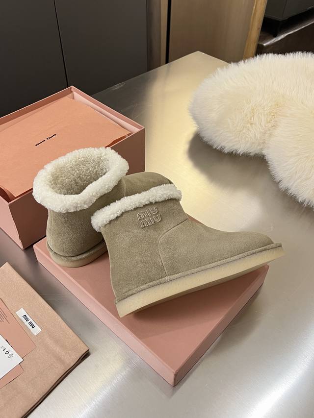Miumiu秋冬秀场同款纯羊毛雪地靴温柔登场~ 采用原版1:1包边工艺,高配版型细节拉满 这个冬天,甜酷少女感与温暖我都要 丝光牛反绒面料细腻显贵,鞋口羊毛绒边蓬松柔软,不仅视觉升温更能悄悄修饰脚踝线条,穿出纤细小腿~ 轻巧水晶大底,走路不累脚 无论是出街还是通勤,轻松驾驭多种场合。 三款高级色可选:栗色|沙色|桃木色 码数35-40,专为精致女孩准备。 这个冬天,让双脚陷进温柔里