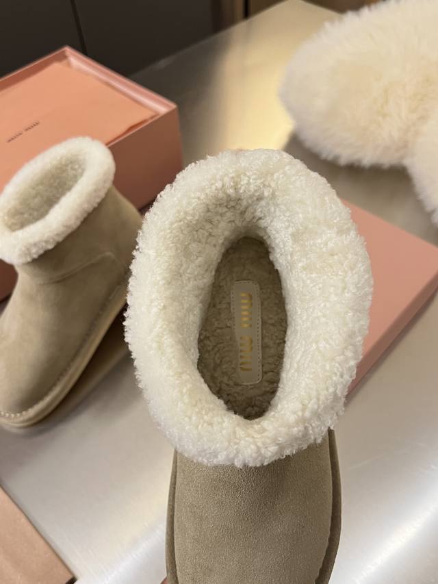 / Miumiu秋冬秀场同款纯羊毛雪地靴温柔登场~ 采用原版1:1包边工艺,高配版型细节拉满 这个冬天,甜酷少女感与温暖我都要 丝光牛反绒面料细腻显贵,鞋口羊毛绒边