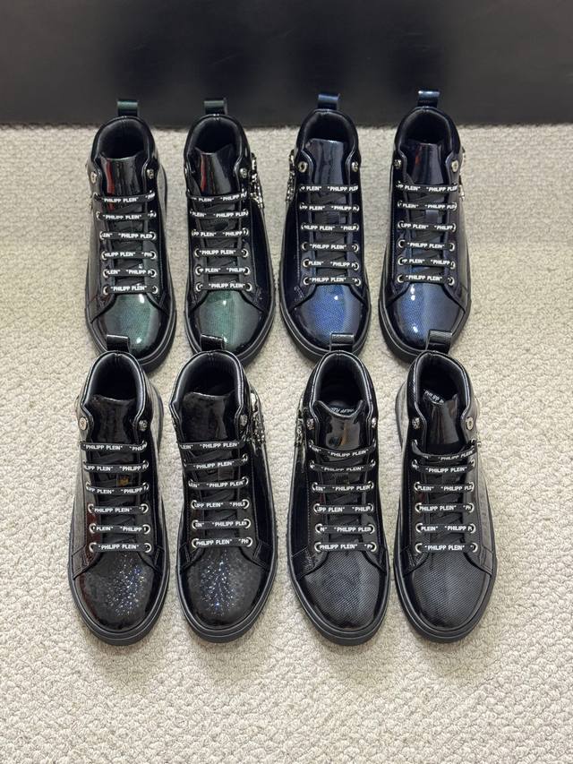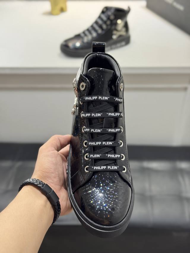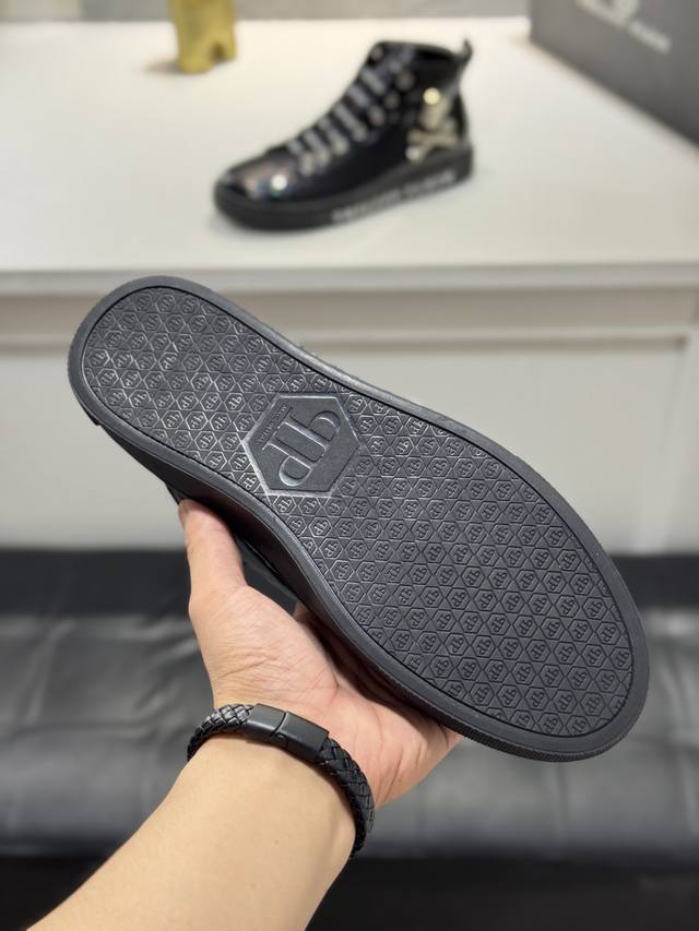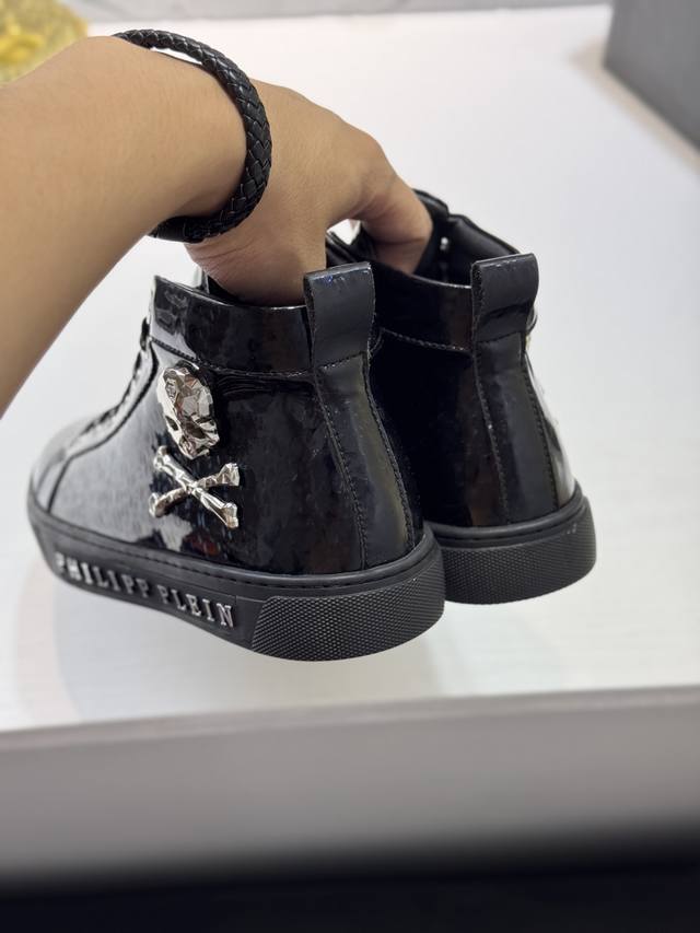 Philipp Plein-菲利普普来因 普来因潮流男士高帮系列休闲鞋在经典的基础上采用流线型设计这款采用牛皮搭配五金配件羊皮内里精心制作,层次鲜明,增加时尚指数,超耐看。 实价 Size:38-44 45定制