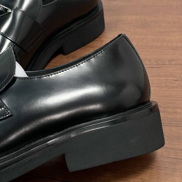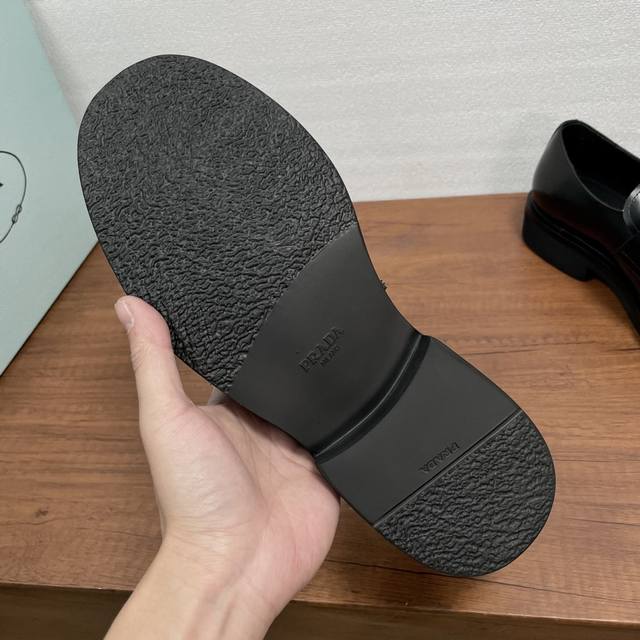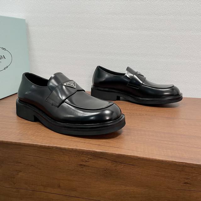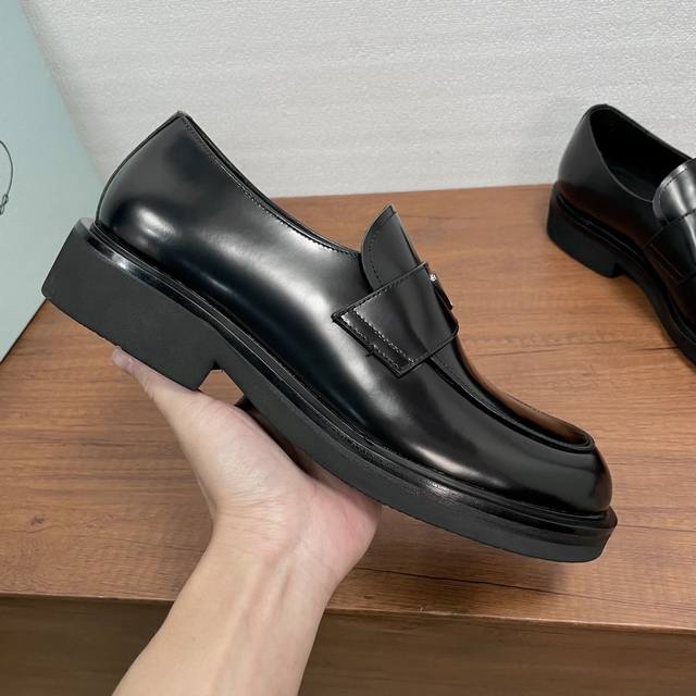 prada 男士新款皮革乐福鞋 Ddd 这款乐福鞋彰显优雅气质和摩登风范。采用黑色小牛皮和亮面手工擦色开边珠皮革精心制作,正面横饰带饰有标志性三角金属珐琅徽标细节,进口车床精工缝线,套脚便鞋款式设计,搭配真皮沿条组合硫化防滑耐磨Eva发泡轻盈大底,全小牛皮及烫金徽标牛皮垫脚,尽显男士魅力。款式经典时尚,上脚舒适耐看!配原盒包装防尘袋! Ddd 码数:39-40-41-42-43-44 标准皮鞋尺码 38 45定做不退换 Ddd 货号:Xy131三角标 黑色开边珠 DDD
