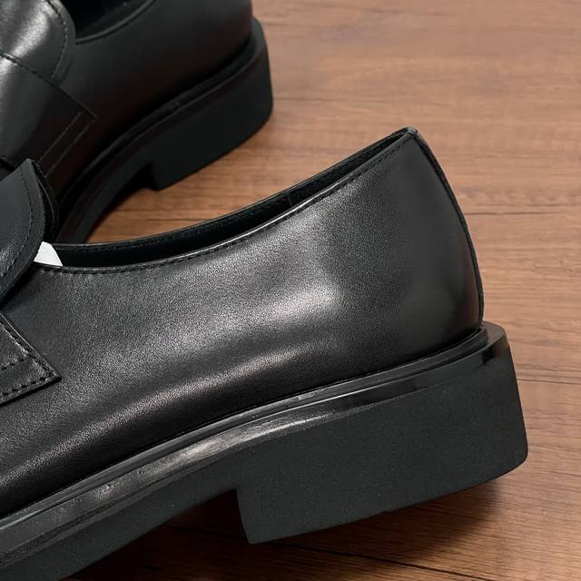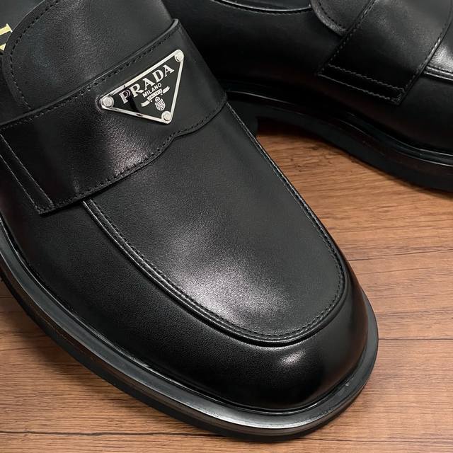 prada 男士新款皮革乐福鞋 Ddd 这款乐福鞋彰显优雅气质和摩登风范。采用黑色小牛皮和亮面手工擦色开边珠皮革精心制作,正面横饰带饰有标志性三角金属珐琅徽标细节,进口车床精工缝线,套脚便鞋款式设计,搭配真皮沿条组合硫化防滑耐磨Eva发泡轻盈大底,全小牛皮及烫金徽标牛皮垫脚,尽显男士魅力。款式经典时尚,上脚舒适耐看!配原盒包装防尘袋! Ddd 码数:39-40-41-42-43-44 标准皮鞋尺码 38 45定做不退换 Ddd 货号:Xy131三角标 黑色牛皮 DDD