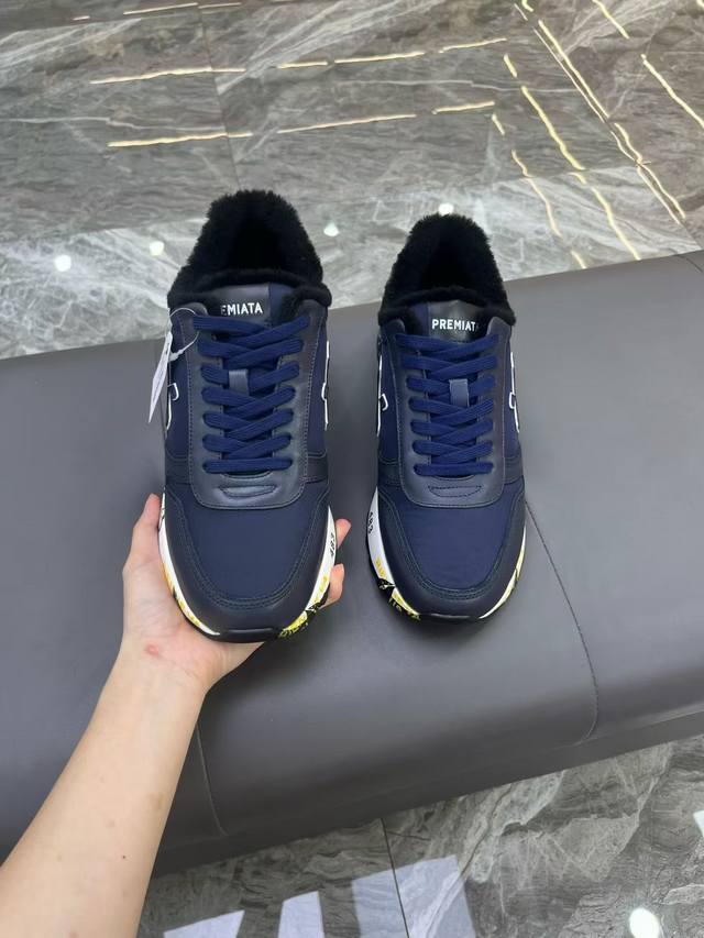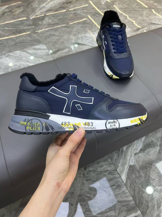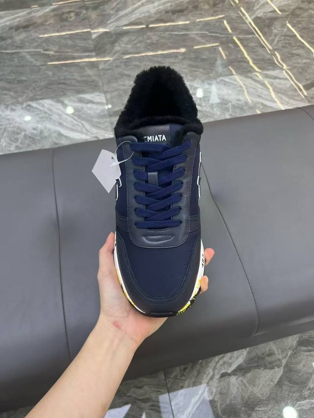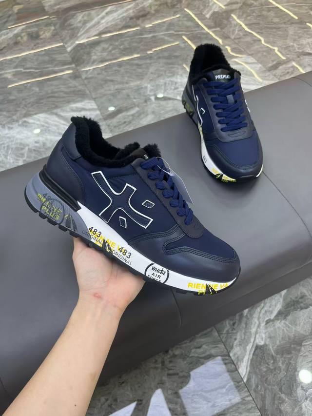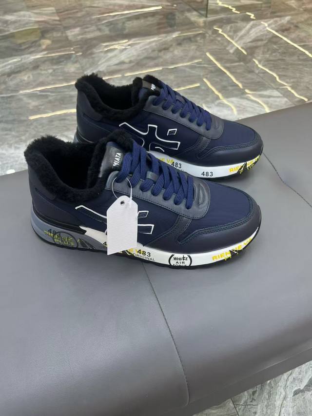Premiata 普瑞米亚达 -高端品质 原单 休闲运动鞋 -鞋面:反绒小牛皮、品牌高丝光帆布、鞋身车缝品牌“米”图腾、鞋舌.后跟.丝印品牌Logo -内里:毛里 -大底:超轻Tpu发泡 橡胶;彩印成型大底 -超高品控 做工精细:凸显 高端 贵气 档次 -Size :38-44 45,可订做 Prm0138
