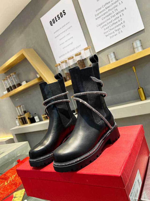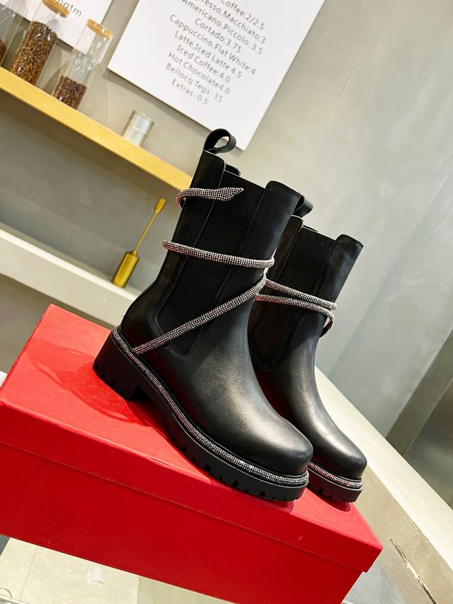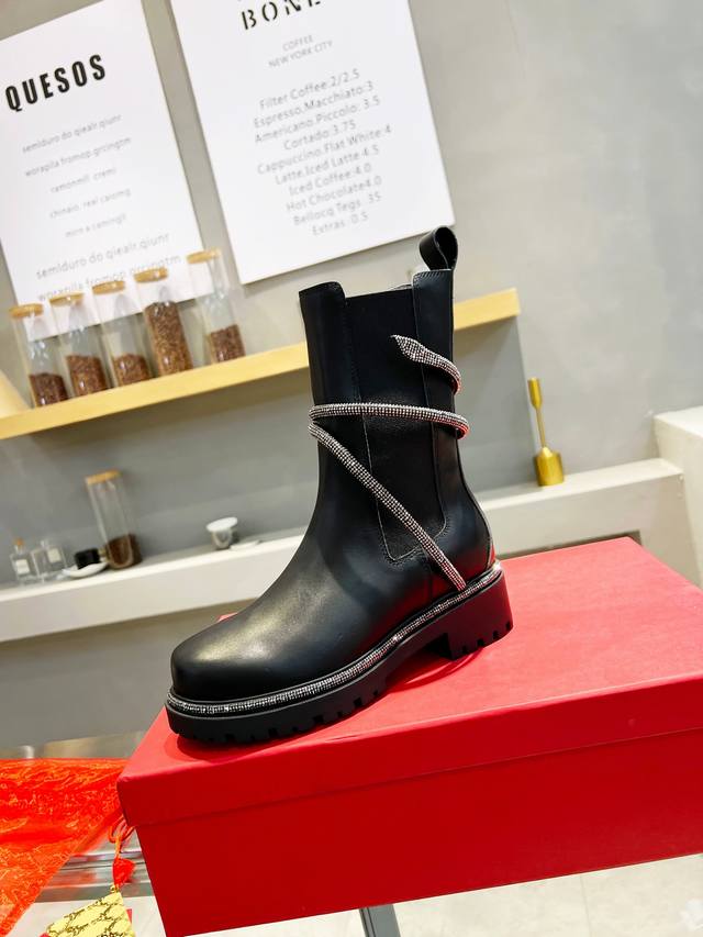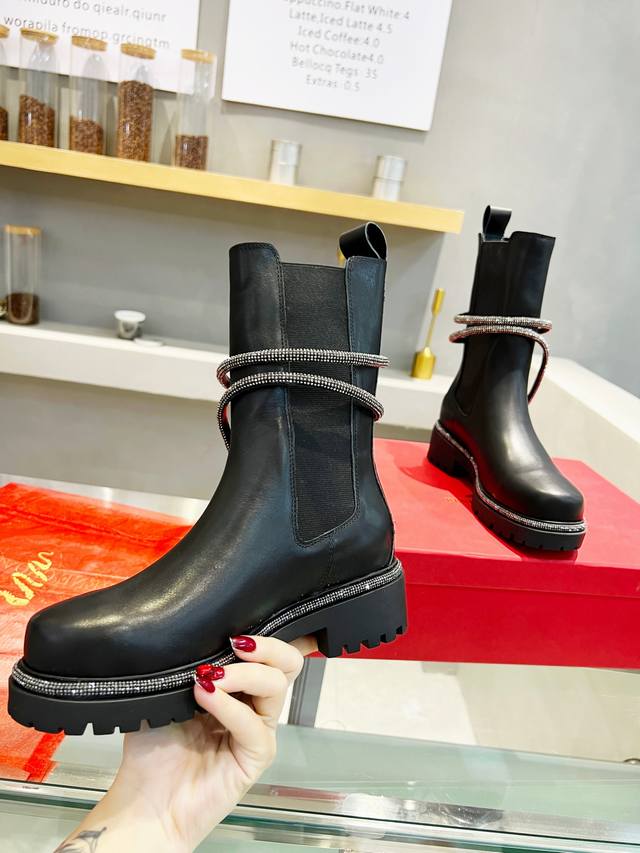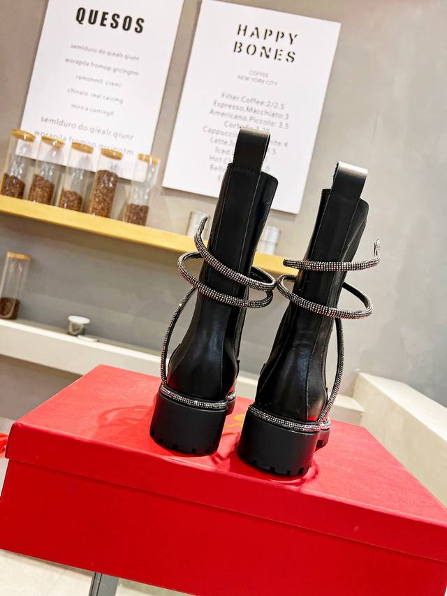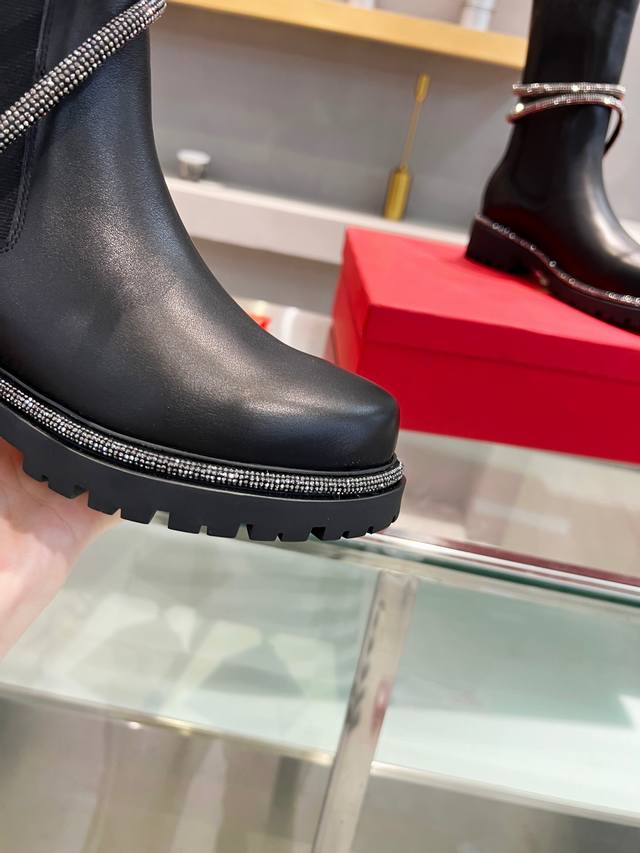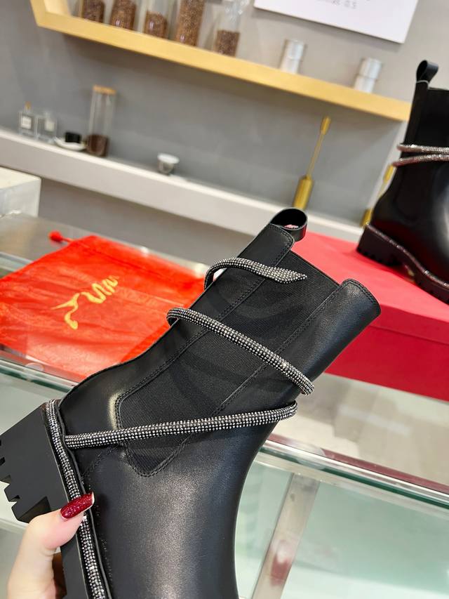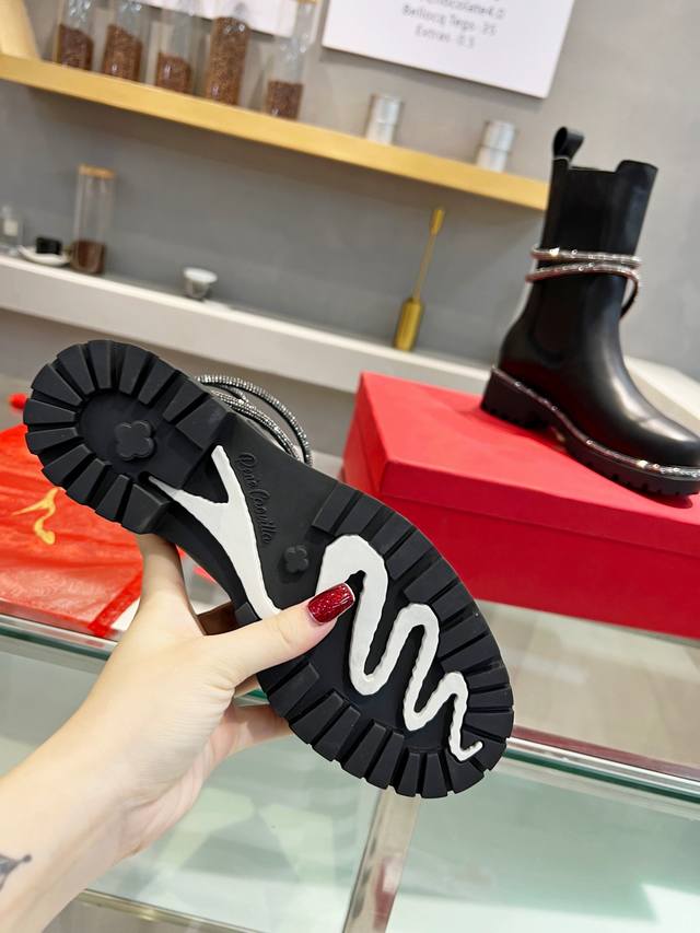 R C 秋冬新款 Rc松紧拼皮提环一脚蹬厚底粗跟切尔西短靴 简单帅气的机车靴设计 永不过时 圆头设计和两侧的弹性松紧,鞋面和鞋底的交界处通过三排水钻组成的装饰加以强调,为这个机车靴的款式带来了休闲感。坚韧不拔的都市风与活泼动人的闪亮触感之间的巧妙融合。经典的机车靴设计,弹力内衬、松紧带插片和后提环设计方便穿脱,标志性的蛇头装饰弹簧形踝带缠绕着脚踝,更凸显出线条美 DDD 面料:进口粒面牛皮 DDD 内里:粒面珠光羊皮里 DDD 大底:原版开模蛇形抓地橡胶大底 DDD Size:35-41 40.41订做不